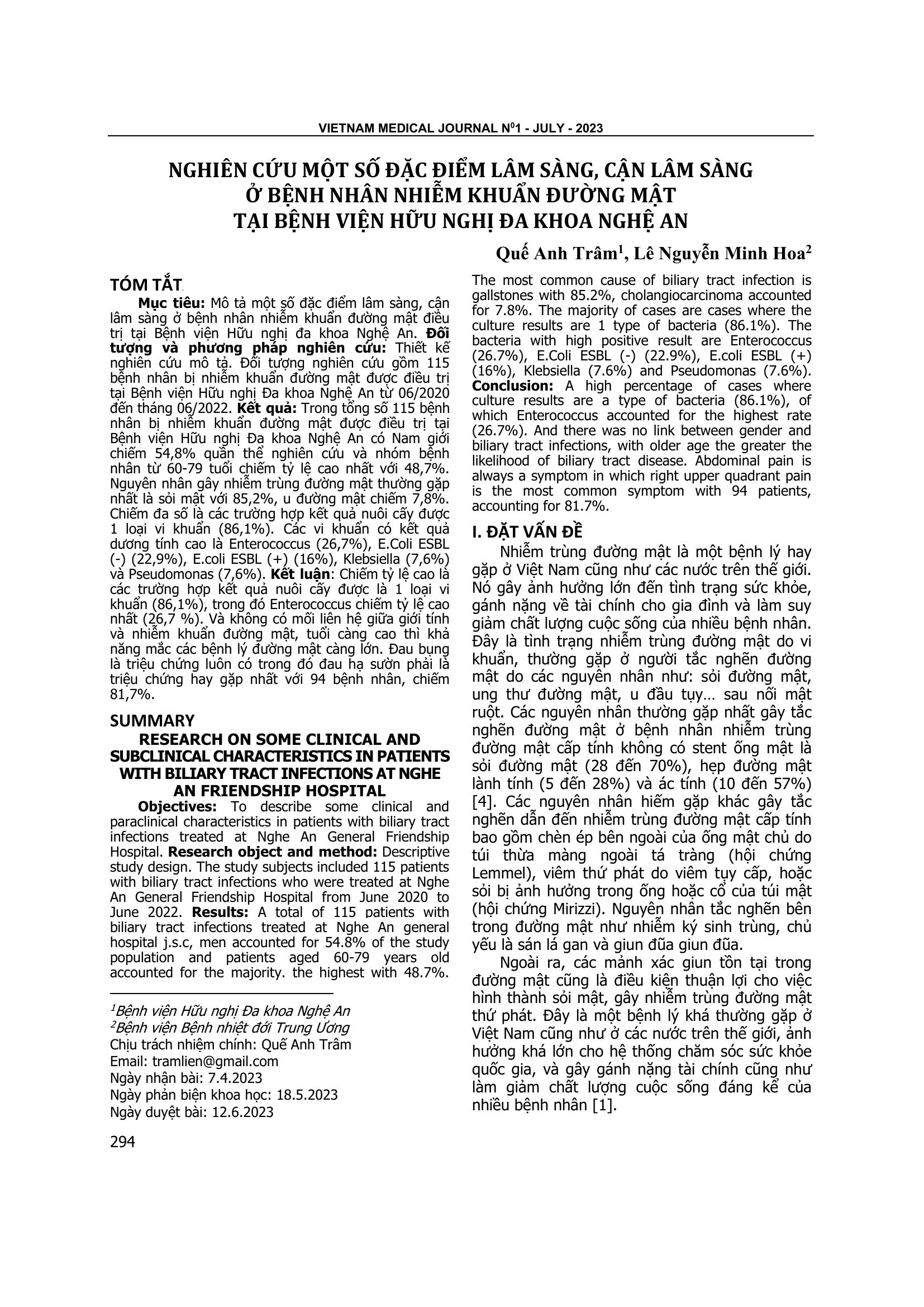 Mô tả một số đặc điểm lâm sàng, cận lâm sàng ở bệnh nhân nhiễm khuẩn đường mật điều trị tại Bệnh viện Hữu nghị đa khoa Nghệ An. Đối tượng và phương pháp nghiên cứu: Thiết kế nghiên cứu mô tả. Đối tượng nghiên cứu gồm 115 bệnh nhân bị nhiễm khuẩn đường mật được điều trị tại Bệnh viện Hữu nghị Đa khoa Nghệ An từ 06/2020 đến tháng 06/2022. Kết quả: Trong tổng số 115 bệnh nhân bị nhiễm khuẩn đường mật được điều trị tại Bệnh viện Hữu nghị Đa khoa Nghệ An có Nam giới chiếm 54,8% quần thể nghiên cứu và nhóm bệnh nhân từ 60-79 tuổi chiếm tỷ lệ cao nhất với 48,7%. Nguyên nhân gây nhiễm trùng đường mật thường gặp nhất là sỏi mật với 85,2%, u đường mật chiếm 7,8%. Chiếm đa số là các trường hợp kết quả nuôi cấy được 1 loại vi khuẩn (86,1%). Các vi khuẩn có kết quả dương tính cao là Enterococcus (26,7%), E.Coli ESBL (-) (22,9%), E.coli ESBL (+) (16%), Klebsiella (7,6%) và Pseudomonas (7,6%). Kết luận: Chiếm tỷ lệ cao là các trường hợp kết quả nuôi cấy được là 1 loại vi khuẩn (86,1%), trong đó Enterococcus chiếm tỷ lệ cao nhất (26,7 %). Và không có mối liên hệ giữa giới tính và nhiễm khuẩn đường mật, tuổi càng cao thì khả năng mắc các bệnh lý đường mật càng lớn. Đau bụng là triệu chứng luôn có trong đó đau hạ sườn phải là triệu chứng hay gặp nhất với 94 bệnh nhân, chiếm 81,7%.