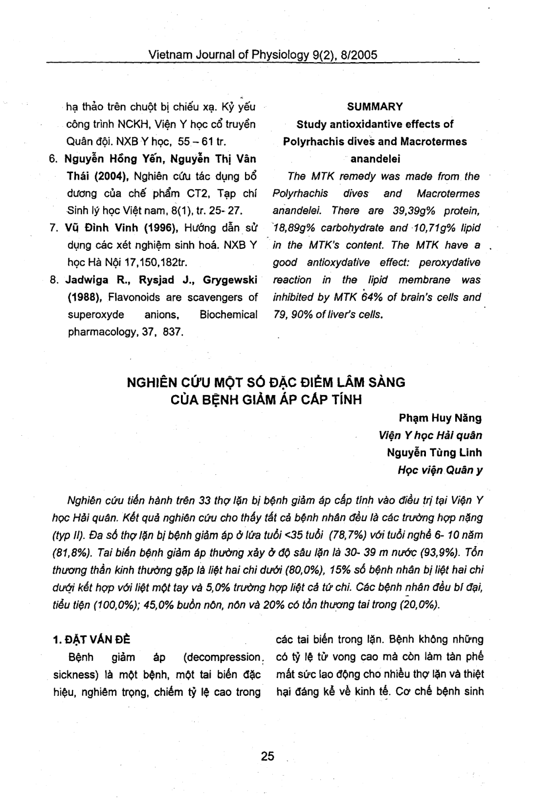 Nghiên cứu được tiến hành trên 33 thợ lặn bị bệnh giảm áp cấp tính điều trị tại Viện Y học Hải quân. Tất cả bệnh nhân đều bị bệnh nặng (typ II). Đa số thợ lặn bị bệnh giảm áp ở lứa tuổi dưới 35 (78,7% ) với tuổi nghề 6-10 năm (81,8% ). Tai biến bệnh thường xảy ra ở độ sâu lặn là 30-39m nước (93,9% ). Tổn thương thần kinh thường gặp là liệt hai chi dưới (80% ), 15% số bệnh nhân bị liệt hai chi dưới kết hợp với liệt một tay và 5,0% trường hợp liệt tứ chi. Các bệnh nhân đều bí đại, tiểu tiện (100% ); 45,0% buồn nôn, nôn và 20% có tổn thương tai trong (20,0% ).