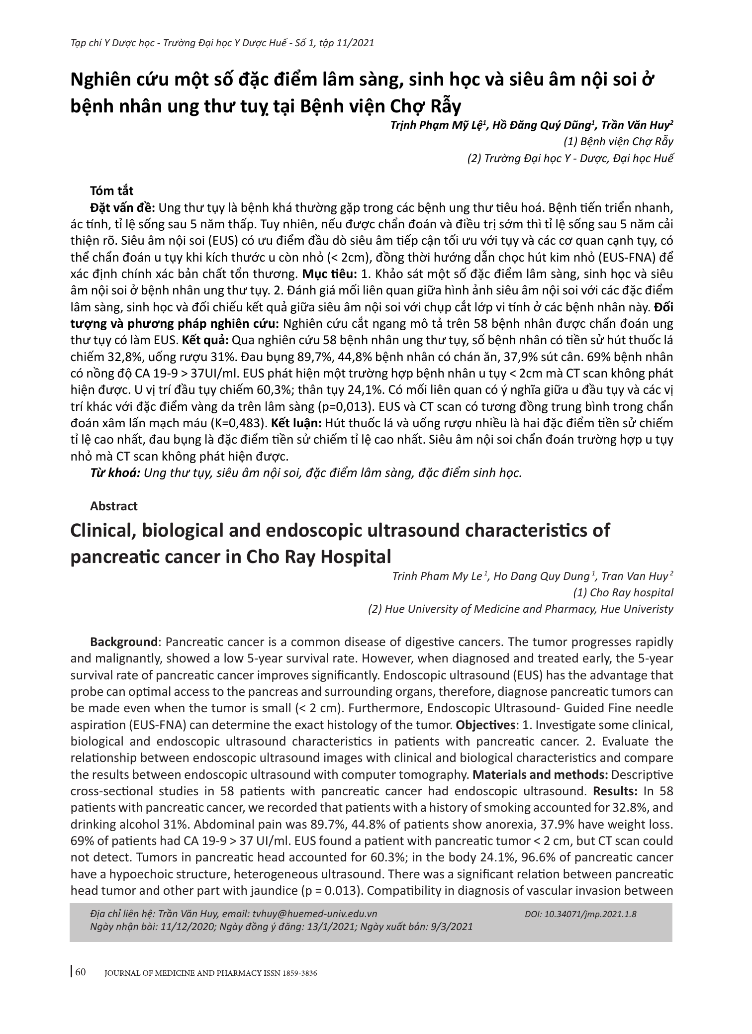 Khảo sát một số đặc điểm lâm sàng, sinh học và siêu âm nội soi ở bệnh nhân ung thư tụy và đánh giá mối liên quan giữa hình ảnh siêu âm nội soi với các đặc điểm lâm sàng, sinh học và đối chiếu kết quả giữa siêu âm nội soi với chụp cắt lớp vi tính ở các bệnh nhân này. Đối tượng và phương pháp nghiên cứu Nghiên cứu cắt ngang mô tả trên 58 bệnh nhân được chẩn đoán ung thư tụy có làm EUS. Kết quả Qua nghiên cứu 58 bệnh nhân ung thư tụy, số bệnh nhân có tiền sử hút thuốc lá chiếm 32,8%, uống rượu 31%. Đau bụng 89,7%, 44,8% bệnh nhân có chán ăn, 37,9% sút cân. 69% bệnh nhân có nồng độ CA 19-9 > 37UI/ml. EUS phát hiện một trường hợp bệnh nhân u tụy < 2cm mà CT scan không phát hiện được. U vị trí đầu tụy chiếm 60,3%; thân tụy 24,1%. Có mối liên quan có ý nghĩa giữa u đầu tụy và các vị trí khác với đặc điểm vàng da trên lâm sàng (p=0,013). EUS và CT scan có tương đồng trung bình trong chẩn đoán xâm lấn mạch máu (K=0,483). Kết luận Hút thuốc lá và uống rượu nhiều là hai đặc điểm tiền sử chiếm tỉ lệ cao nhất, đau bụng là đặc điểm tiền sử chiếm tỉ lệ cao nhất. Siêu âm nội soi chẩn đoán trường hợp u tụy nhỏ mà CT scan không phát hiện được.