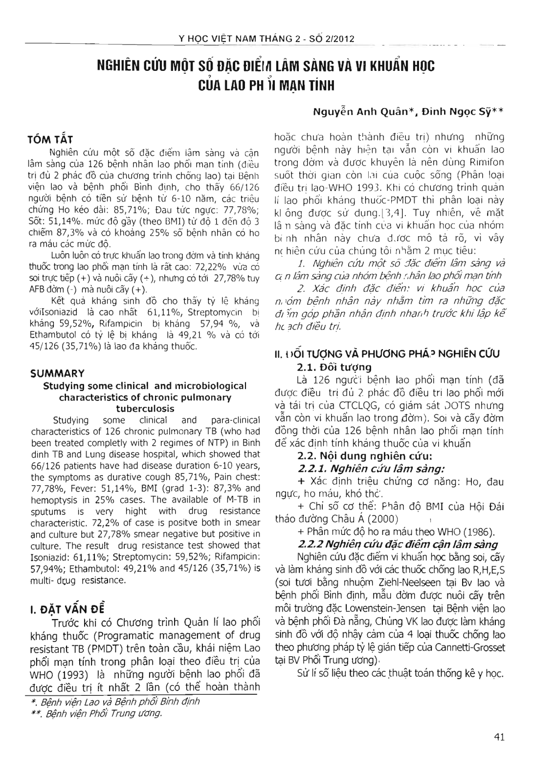 Studying some clinical and para-clinical characteristics of 126 chronic pulmonary TB (who had been treated completly with 2 regimes of NTP) in Binh Dinh TB and Lung disease hospital, which showed that 66/126 patients have had disease duration 6-10 years, the symptoms as durative cough 85.71 percent, Pain chest: 77.78 percent, Fever: 51.14 percent, BMI (grad 1-3): 87.3 percent and hemoptysis in 25 percent cases. The available of M-TB in sputums is very hight with drug resistance characteristic. 72.2 percent of case is positve both in smear and culture but 27.78 percent smear negative but positive in culture. The result drug resistance test showed that Isoniazid: 61.11 percent; Streptomycin: 59.52 percent; Rifampicin: 57.94 percent; Ethambutol: 49.21 percent and 45/126 (35.71 percent) is multi-drug resistance.