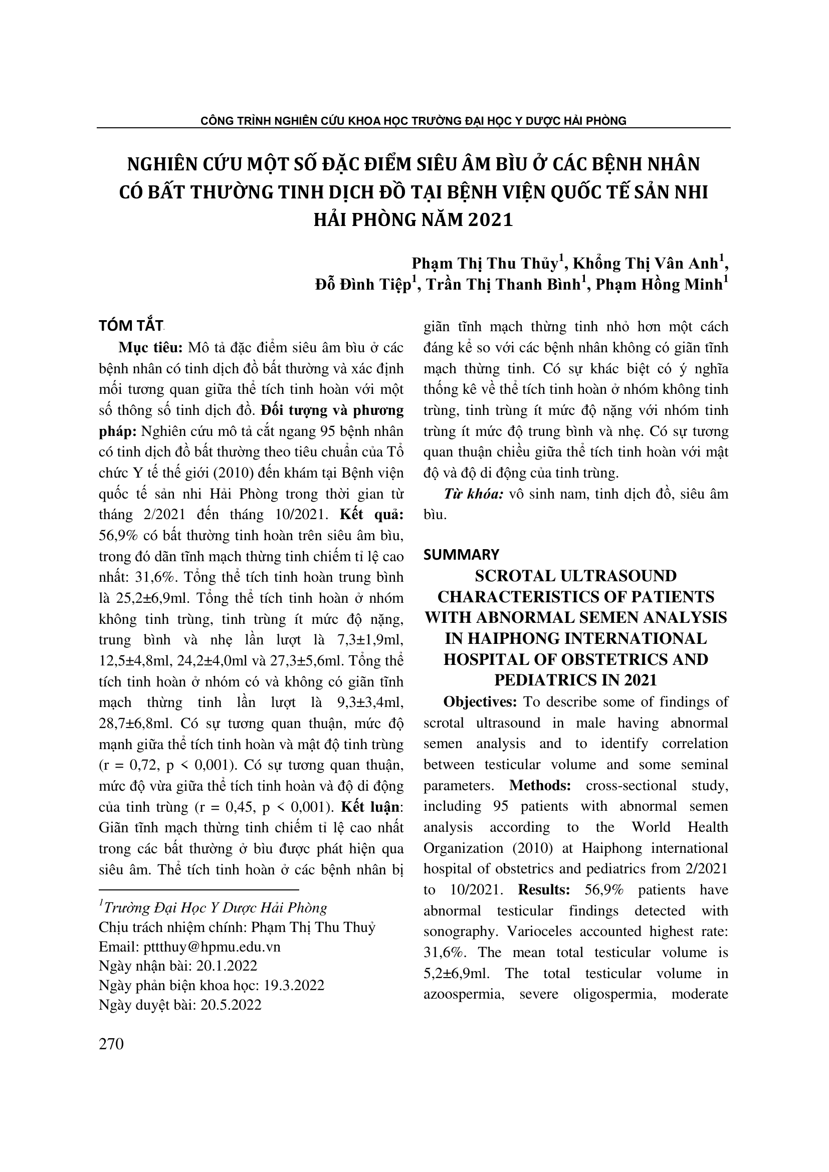 Mô tả đặc điểm siêu âm bìu ở các bệnh nhân có tinh dịch đồ bất thường và xác định mối tương quan giữa thể tích tinh hoàn với một số thông số tinh dịch đồ. Đối tượng và phương pháp: Nghiên cứu mô tả cắt ngang 95 bệnh nhân có tinh dịch đồ bất thường theo tiêu chuẩn của Tổ chức Y tế thế giới (2010) đến khám tại Bệnh viện quốc tế sản nhi Hải Phòng trong thời gian từ tháng 2/2021 đến tháng 10/2021. Kết quả: 56,9% có bất thường tinh hoàn trên siêu âm bìu, trong đó dãn tĩnh mạch thừng tinh chiếm tỉ lệ cao nhất: 31,6%. Tổng thể tích tinh hoàn trung bình là 25,2±6,9ml. Tổng thể tích tinh hoàn ở nhóm không tinh trùng, tinh trùng ít mức độ nặng, trung bình và nhẹ lần lượt là 7,3±1,9ml, 12,5±4,8ml, 24,2±4,0ml và 27,3±5,6ml. Tổng thể tích tinh hoàn ở nhóm có và không có giãn tĩnh mạch thừng tinh lần lượt là 9,3±3,4ml, 28,7±6,8ml. Có sự tương quan thuận, mức độ mạnh giữa thể tích tinh hoàn và mật độ tinh trùng (r = 0,72, p < 0,001). Có sự tương quan thuận, mức độ vừa giữa thể tích tinh hoàn và độ di động của tinh trùng (r = 0,45, p < 0,001). Kết luận: Giãn tĩnh mạch thừng tinh chiếm tỉ lệ cao nhất trong các bất thường ở bìu được phát hiện qua siêu âm. Thể tích tinh hoàn ở các bệnh nhân bị giãn tĩnh mạch thừng tinh nhỏ hơn một cách đáng kể so với các bệnh nhân không có giãn tĩnh mạch thừng tinh. Có sự khác biệt có ý nghĩa thống kê về thể tích tinh hoàn ở nhóm không tinh trùng, tinh trùng ít mức độ nặng với nhóm tinh trùng ít mức độ trung bình và nhẹ. Có sự tương quan thuận chiều giữa thể tích tinh hoàn với mật độ và độ di động của tinh trùng.
