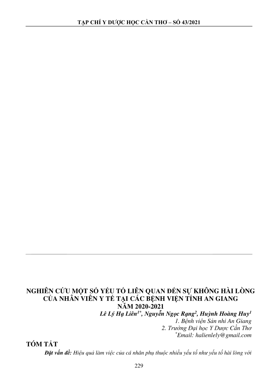 Hiệu quả làm việc của cá nhân phụ thuộc nhiều yếu tố như yếu tố hài lòng với môi trường làm việc, chính sách, lương và phúc lợi, với lãnh đạo, đồng nghiệp và các chế độ được hưởng… và nhiều nghiên cứu đã chỉ ra rằng sự hài lòng với các yếu tố này thì nhân viên y tế sẽ đảm bảo đủ duy trì nguồn nhân lực và nâng cao chất lượng dịch vụ tại các cơ sở y tế. Mục tiêu nghiên cứu: Xác định một số yếu tố liên quan đến sự không hài lòng của nhân viên y tế tại các bệnh viện tỉnh An Giang. Đối tượng và phương pháp nghiên cứu: Nghiên cứu mô tả cắt ngang được tiến hành trên 1000 nhân viên y tế đang công tác tại các bệnh viện tỉnh An Giang từ tháng 07/2020 đến tháng 07/2021. Kết quả: Các yếu tố ảnh hưởng đến sự không hài lòng trong công việc của nhân viên y tế là tình trạng hôn nhân OR=1,48 KTC 95% 1,07-2,06; tham gia trực OR=1,52 KTC 95% 1,13-2,05; chuyên môn đào tạo OR=2,83 KTC 95% 1,62-4,94 và vị trí công tác OR=0,54 KTC 95% 0,29-0,98. Kết luận: Các yếu tố về hôn nhân, trực, chuyên môn đào tạo và vị trí làm việc có liên quan đến sự không hài lòng trong công việc của nhân viên y tế tại các bệnh viện tỉnh An Giang.
