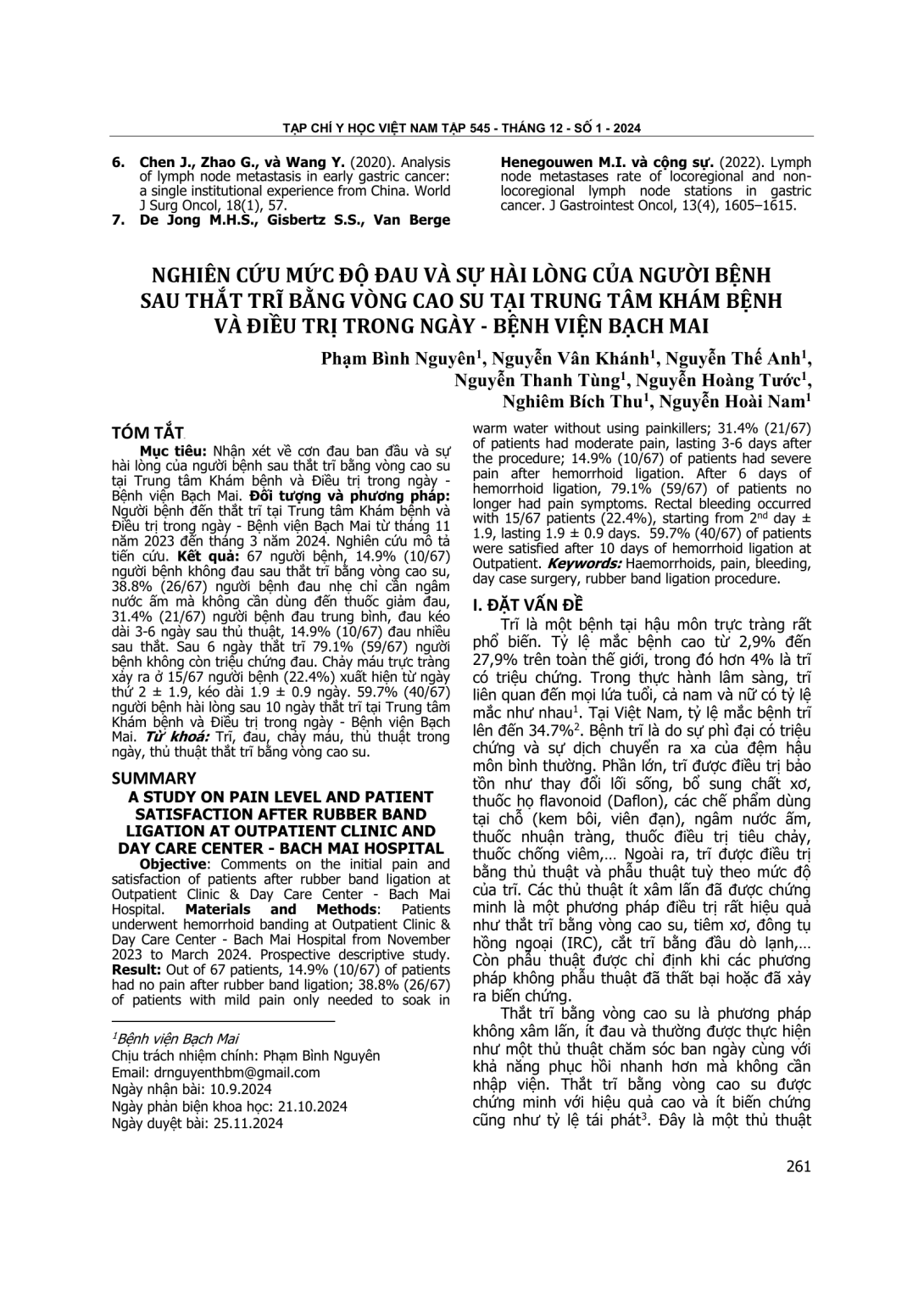 Comments on the initial pain and satisfaction of patients after rubber band ligation at Outpatient Clinic & Day Care Center - Bach Mai Hospital. Materials and Methods: Patients underwent hemorrhoid banding at Outpatient Clinic & Day Care Center - Bach Mai Hospital from November 2023 to March 2024. Prospective descriptive study. Result: Out of 67 patients, 14.9% (10/67) of patients had no pain after rubber band ligation; 38.8% (26/67) of patients with mild pain only needed to soak in warm water without using painkillers; 31.4% (21/67) of patients had moderate pain, lasting 3-6 days after the procedure; 14.9% (10/67) of patients had severe pain after hemorrhoid ligation. After 6 days of hemorrhoid ligation, 79.1% (59/67) of patients no longer had pain symptoms. Rectal bleeding occurred with 15/67 patients (22.4%), starting from 2nd day ± 1.9, lasting 1.9 ± 0.9 days. 59.7% (40/67) of patients were satisfied after 10 days of hemorrhoid ligation at Outpatient.