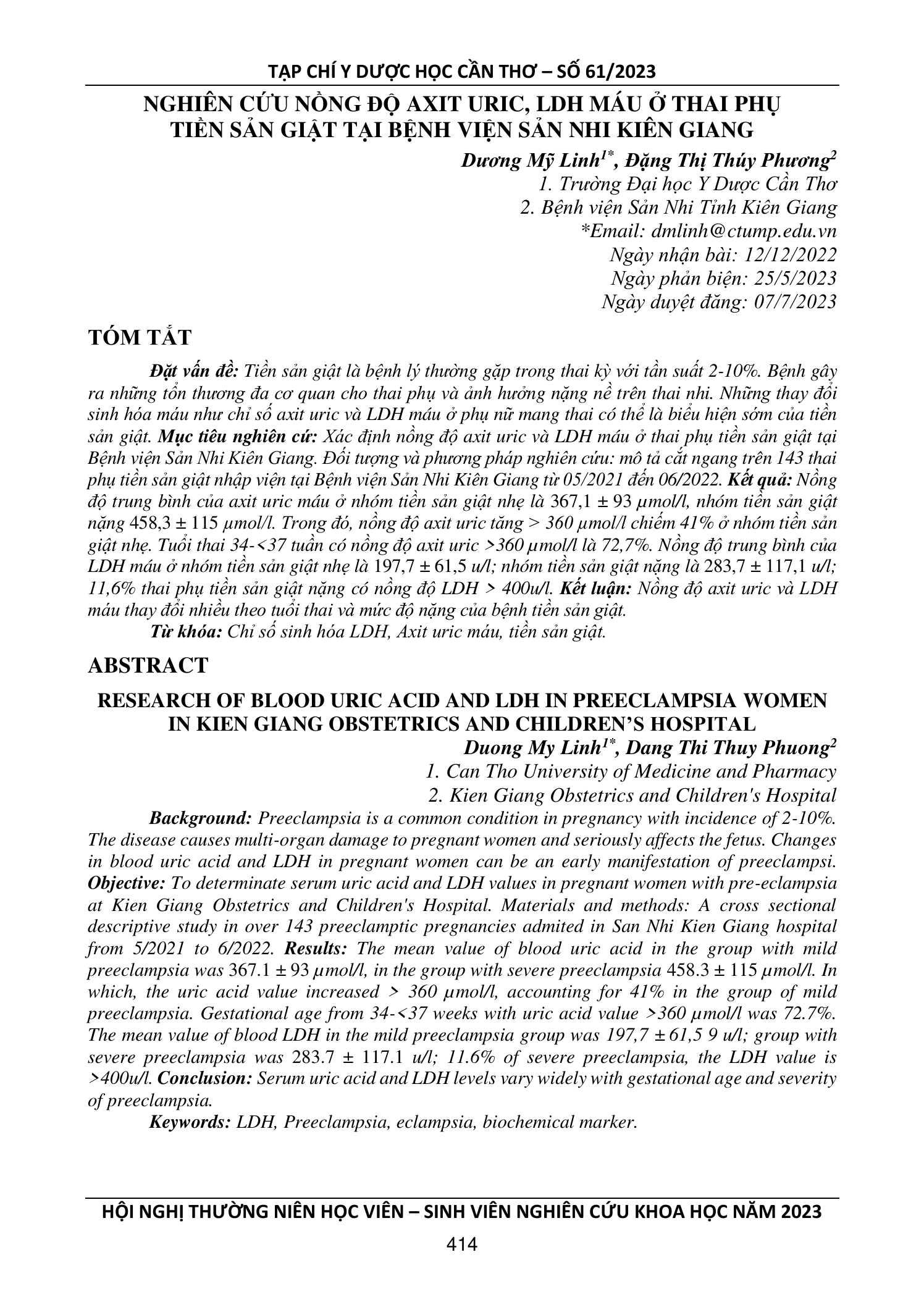 Xác định nồng độ axit uric và LDH máu ở thai phụ tiền sản giật tại Bệnh viện Sản Nhi Kiên Giang. Đối tượng và phương pháp nghiên cứu: mô tả cắt ngang trên 143 thai phụ tiền sản giật nhập viện tại Bệnh viện Sản Nhi Kiên Giang từ 05/2021 đến 06/2022. Kết quả: Nồng độ trung bình của axit uric máu ở nhóm tiền sản giật nhẹ là 367,1 ± 93 μmol/l, nhóm tiền sản giật nặng 458,3 ± 115 μmol/l. Trong đó, nồng độ axit uric tăng > 360 μmol/l chiếm 41% ở nhóm tiền sản giật nhẹ. Tuổi thai 34-<37 tuần có nồng độ axit uric >360 μmol/l là 72,7%. Nồng độ trung bình của LDH máu ở nhóm tiền sản giật nhẹ là 197,7 ± 61,5 u/l; nhóm tiền sản giật nặng là 283,7 ± 117,1 u/l; 11,6% thai phụ tiền sản giật nặng có nồng độ LDH > 400u/l. Kết luận: Nồng độ axit uric và LDH máu thay đổi nhiều theo tuổi thai và mức độ nặng của bệnh tiền sản giật.
