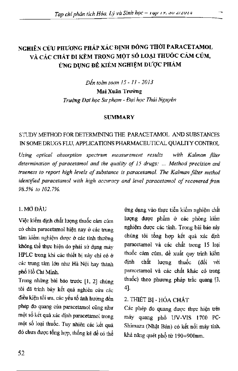 Nghiên cứu phương pháp xác định đồng thời paracetamol và các chất đi kèm trong một số loại thuốc cảm cúm, ứng dụng để kiểm nghiệm dược phẩm