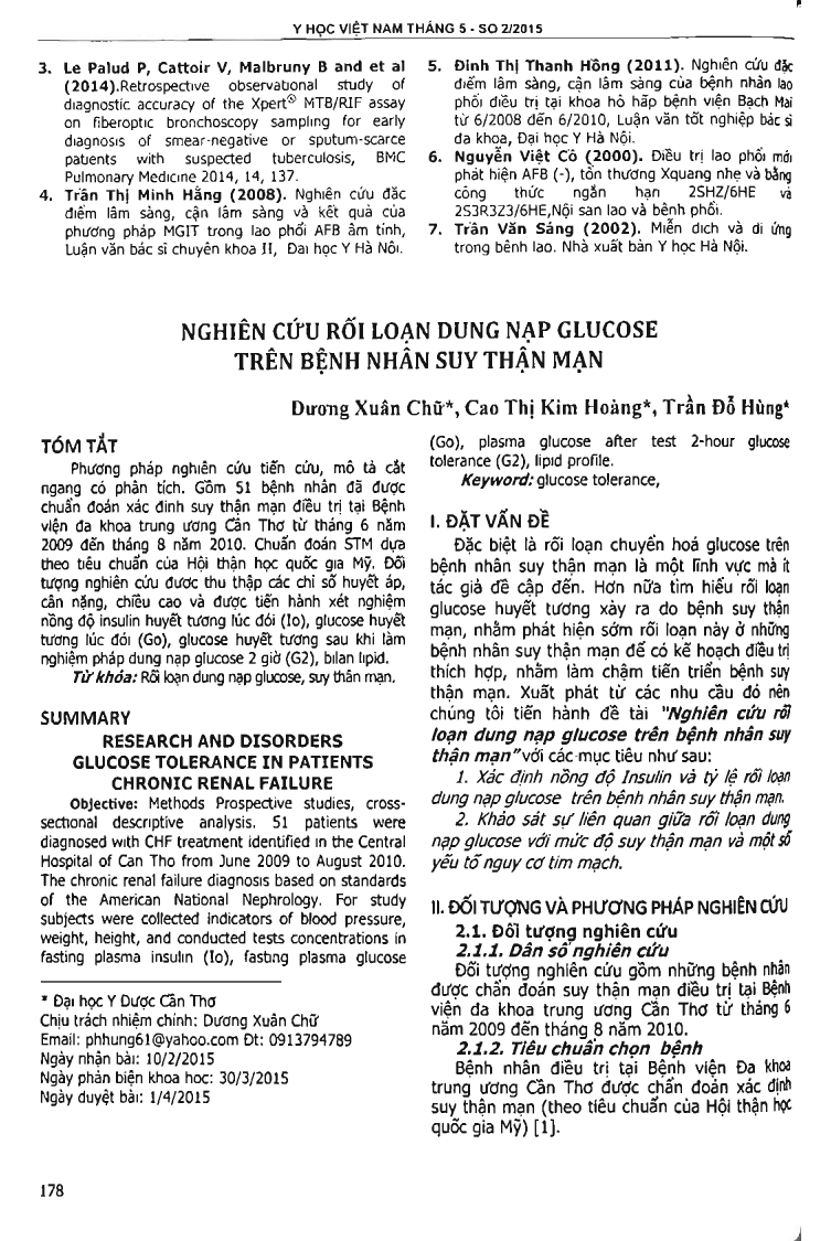 Objective: Methods Prospective studies, cross. sectional descriptive analysis. 51 patients were diagnosed with CHF treatment identified in the Central Hospital of Can Tho from June 2009 to August 2010. The chronic renal failure diagnosis based on standards of the American National Nephrology. For study subjects were collected indicators of blood pressure, weight, height, and conducted tests concentrations in fasting plasma insulin (10), fasting plasma glucose (Go), plasma glucose after test 2-hour glucose, tolerance (G2), lipid profile.