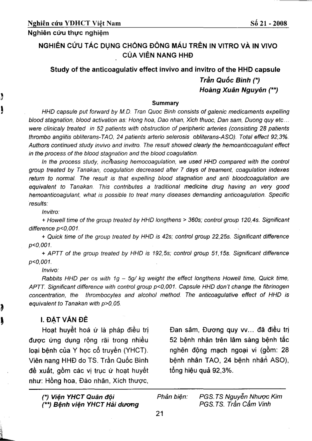 Nghiên cứu tác dụng chống đông máu trên in vitro và in vivo của viên nang HHĐ