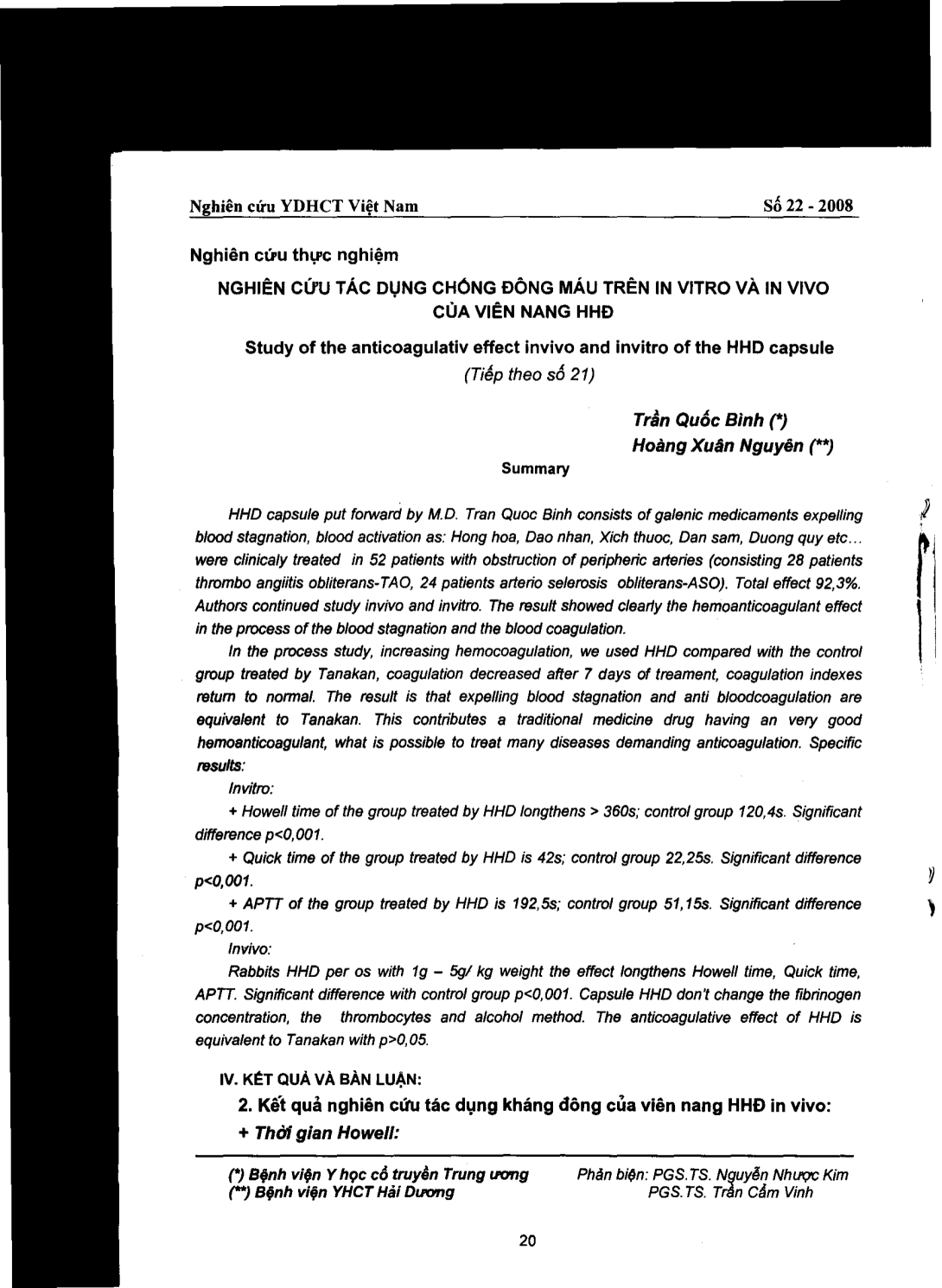 Nghiên cứu tác dụng chống đông máu trên invitro và in vivo của viên nang HHĐ