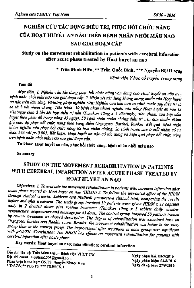 Đánh giá tác dụng phục hồi chức năng vận động của hoạt huyết dưỡng não trên 50 bệnh nhân nhồi máu não sau giai đoạn cấp (nhóm nghiên cứu) so với 50 bệnh nhân nhóm chứng điều trị nền đơn thuần. Kết quả cho thấy bệnh nhân nhóm nghiên cứu phục hồi chức năng tốt hơn nhóm chứng. So sánh trước sau ở mỗi nhóm có sự khac biệt với p0,001.