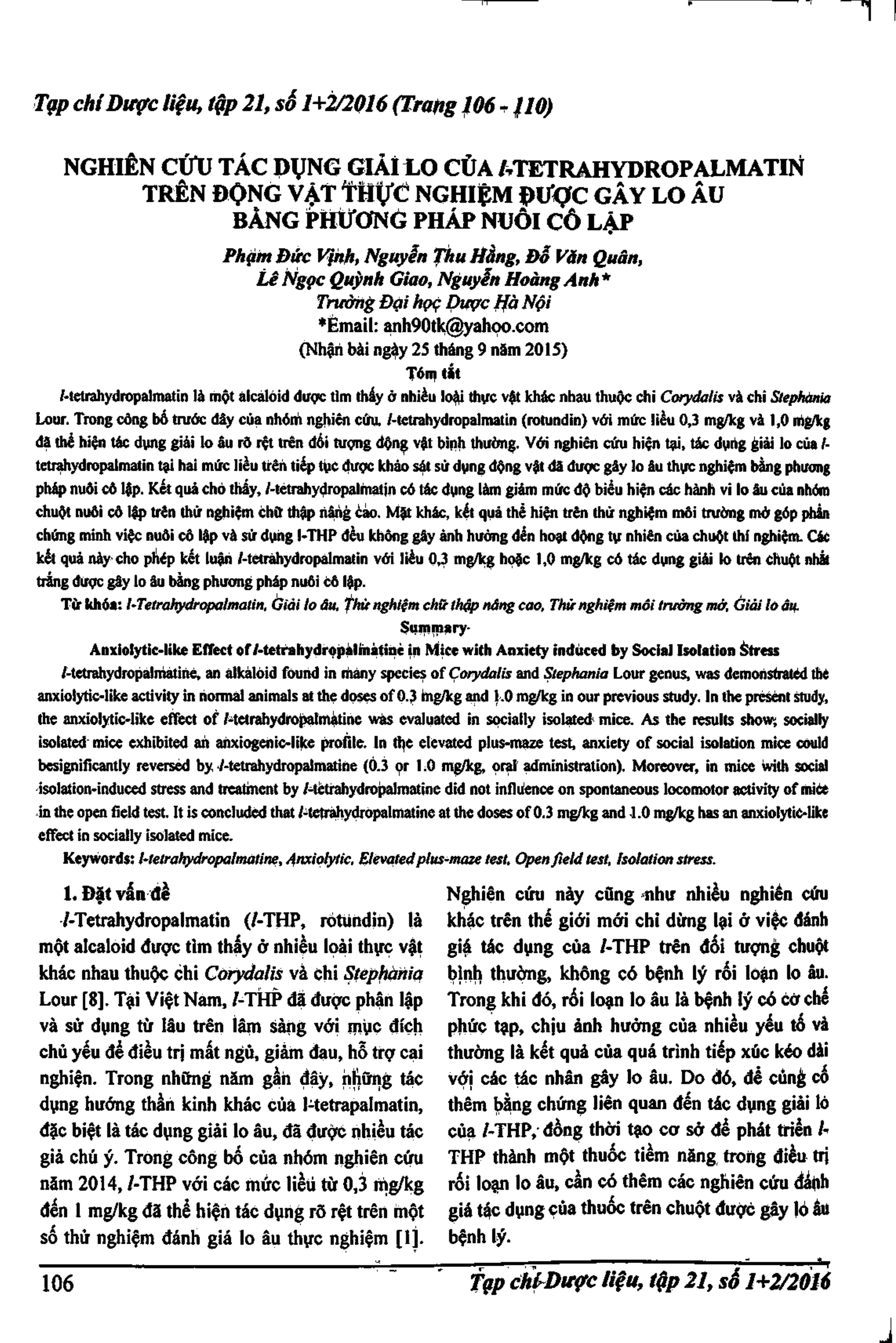 Nghiên cứu tác dụng giải lo của i-tetrahydropalmatin trên động vật thực nghiệm được gây lo âu bằng phương pháp nuôi cô lập