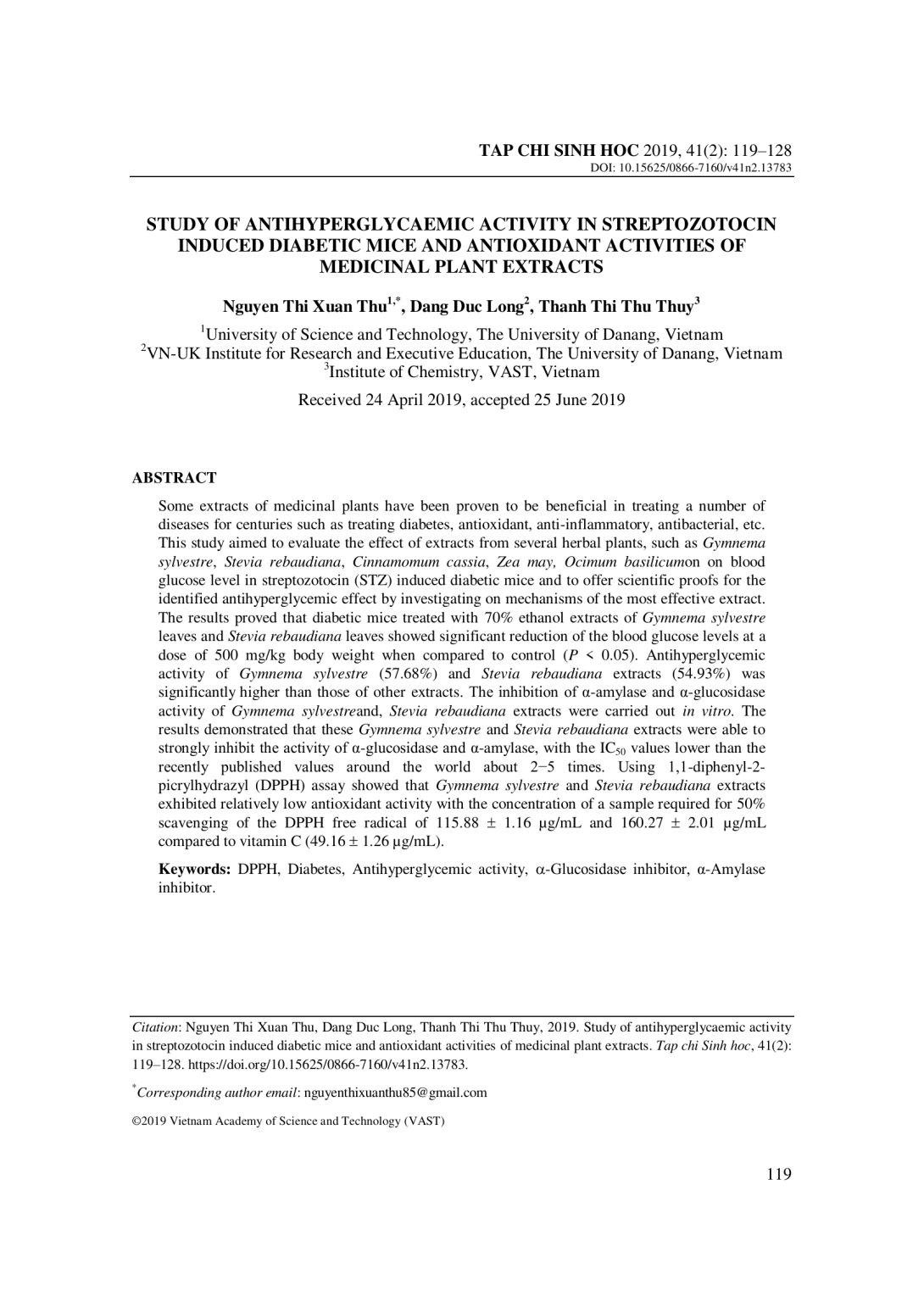 Some extracts of medicinal plants have been proven to bebeneficial in treating a number of diseases for centuriessuch as treating diabetes, antioxidant, anti-inflammatory, antibacterial, etc.This study aimed to evaluate the effect of extracts from several herbal plants, such as Gymnema sylvestre, Stevia rebaudiana, Cinnamomum cassia,Zea may, Ocimum basilicumon on blood glucose level in streptozotocin (STZ) induced diabetic mice and to offer scientific proofs for the identified antihyperglycemic effect by investigating on mechanismsof the most effective extract. The results proved that diabetic mice treated with 70% ethanol extracts of Gymnema sylvestre leaves and Stevia rebaudiana leaves showed significant reduction of the blood glucose levels ata dose of 500 mg/kg body weight when compared to control (P <0.05). Antihyperglycemic activity of Gymnema sylvestre(57.68%) and Stevia rebaudiana extracts (54.93%) was significantlyhigherthanthose of other extracts. The inhibition of α-amylase and α-glucosidase activity of Gymnema sylvestreand, Stevia rebaudiana extracts were carried out in vitro. The results demonstrated that these Gymnema sylvestreand Stevia rebaudiana extracts were able to strongly inhibit the activity of α-glucosidase and α-amylase, with the IC50values lowerthan the recently published values around the world about 2−5 times. Using 1,1-diphenyl-2-picrylhydrazyl (DPPH) assay showed that Gymnema sylvestreand Stevia rebaudiana extractsexhibited relatively low antioxidant activity with the concentration of a sample required for 50% scavenging of the DPPH free radical of 115.88 1.16 μg/mL and 160.27 2.01 μg/mL compared to vitamin C (49.16 1.26 μg/mL).