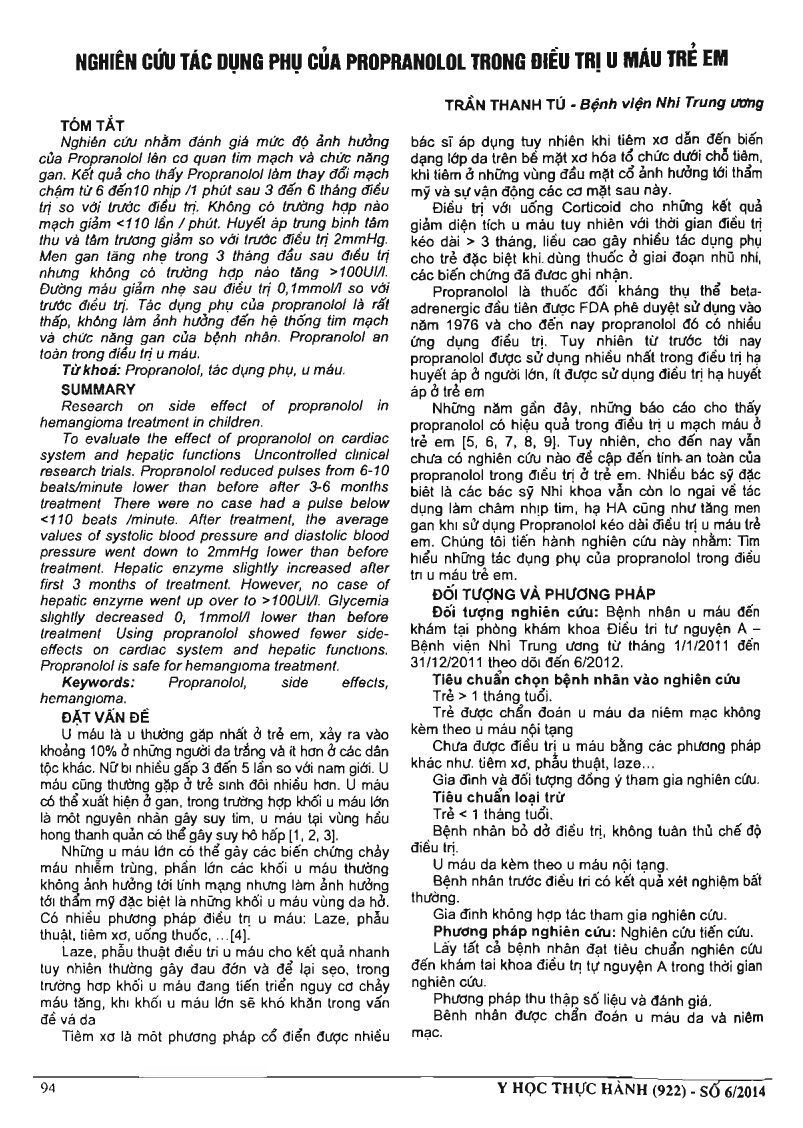 To evaluate the effect of propranolol on cardiac system and hepatic functions. Uncontrolled clinical research trials. Propranolol reduced pulses from 6-10 beats/minute lower than before after 3-6 months treatment. There were no case had a pulse below 110 beats /minute. After treatment, the average values of systolic blood pressure and diastolic blood pressure went down to 2mmHg lower than before treatment. Hepatic enzyme slightly increased after first 3 months of treatment. However, no case of hepatic enzyme went up over to 100UI/l. Glycemia slightly decreased 0,1 mmol/l lower than before treatment. Using propranolol showed fewer sideeffects on cardiac system and hepatic functions. Propranolol is safe for hemangioma treatment.