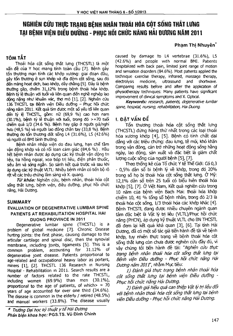 Degenerative lumbar spine is a problem of global medicine. Chronic disease hurting joints: the first phase, causing damage to the articular cartilage and spinal disc, then the synovial membrane, including joints, ligaments. This is a common problem, accounting for 31.12 percent of degenerative joint disease. Patients proportional to age-related and occupational heavy labor as porters, miners. Degenerative lumbar spine 136 Research in Nursing Hospital - Rehabilitation in 2011. Search results are a number of factors related to the rate of degenerative lumbar spine, including women (69.9 percent) than men (30.1 percent), proportional to the age of patients, of which or = 70 years of age accounted for over one third (34.6 percent). The disease is common in the elderly/retired (48.5 percent) and manual workers (33.8 percent). The disease usually caused by damage to L4 vertebrae (31.6 percent), L5 (42.6 percent) and people with normal BMI. Patients hospitalized with back pain, limited joint range of motion and sensation disorders (84.6 percent). Most patients applied the technique exercise therapy, infrared, massage therapy, electrolysis medicine, ultrasound and shortwave. Comparing results before and after the application of physiotherapy techniques: Many patients have significant improvement of dinical symptoms and X. Optical.