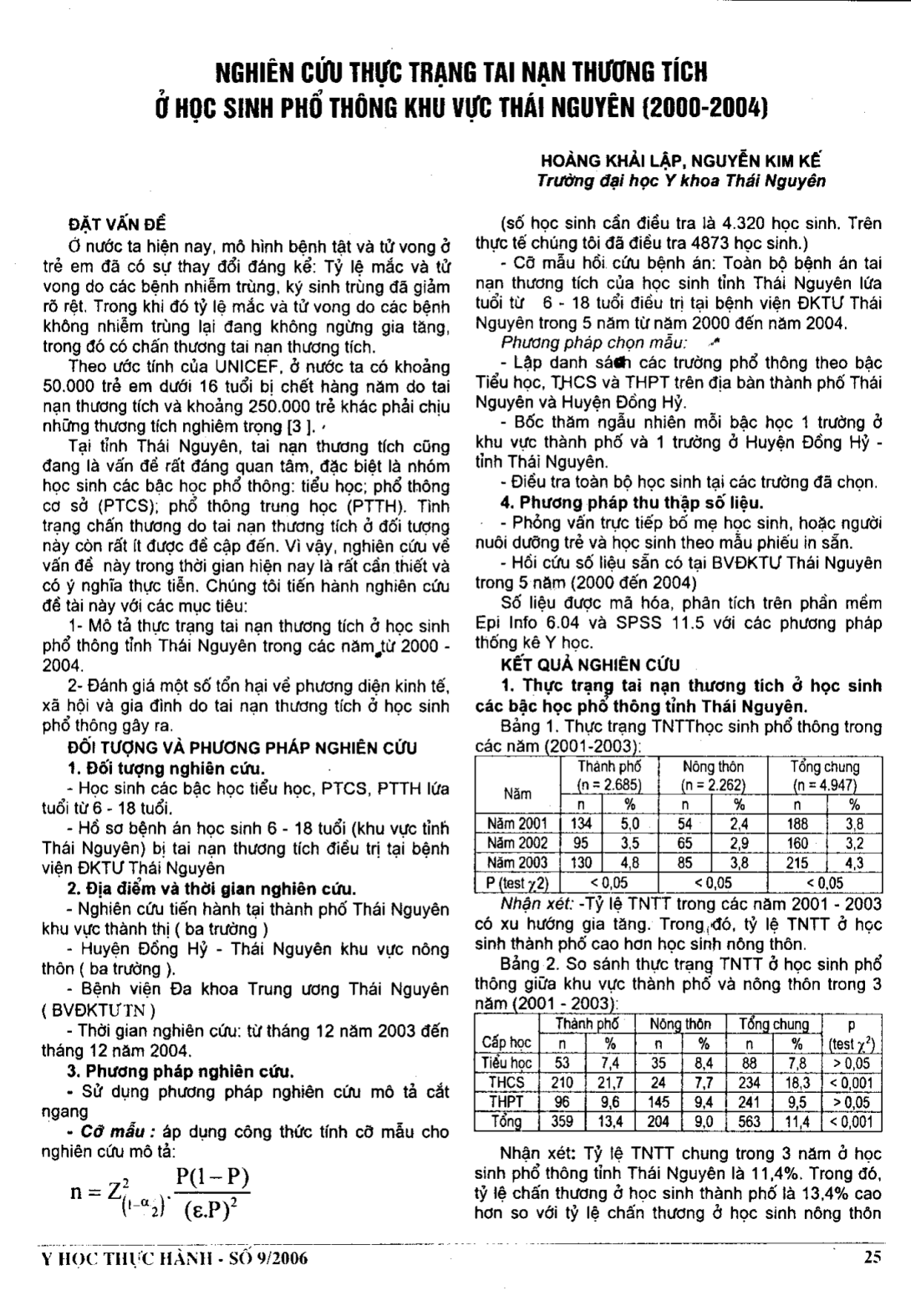 Nghiên cứu thực trạng tai nạn thương tích ở học sinh phổ thông khu vực Thái Nguyên (2000-2004)