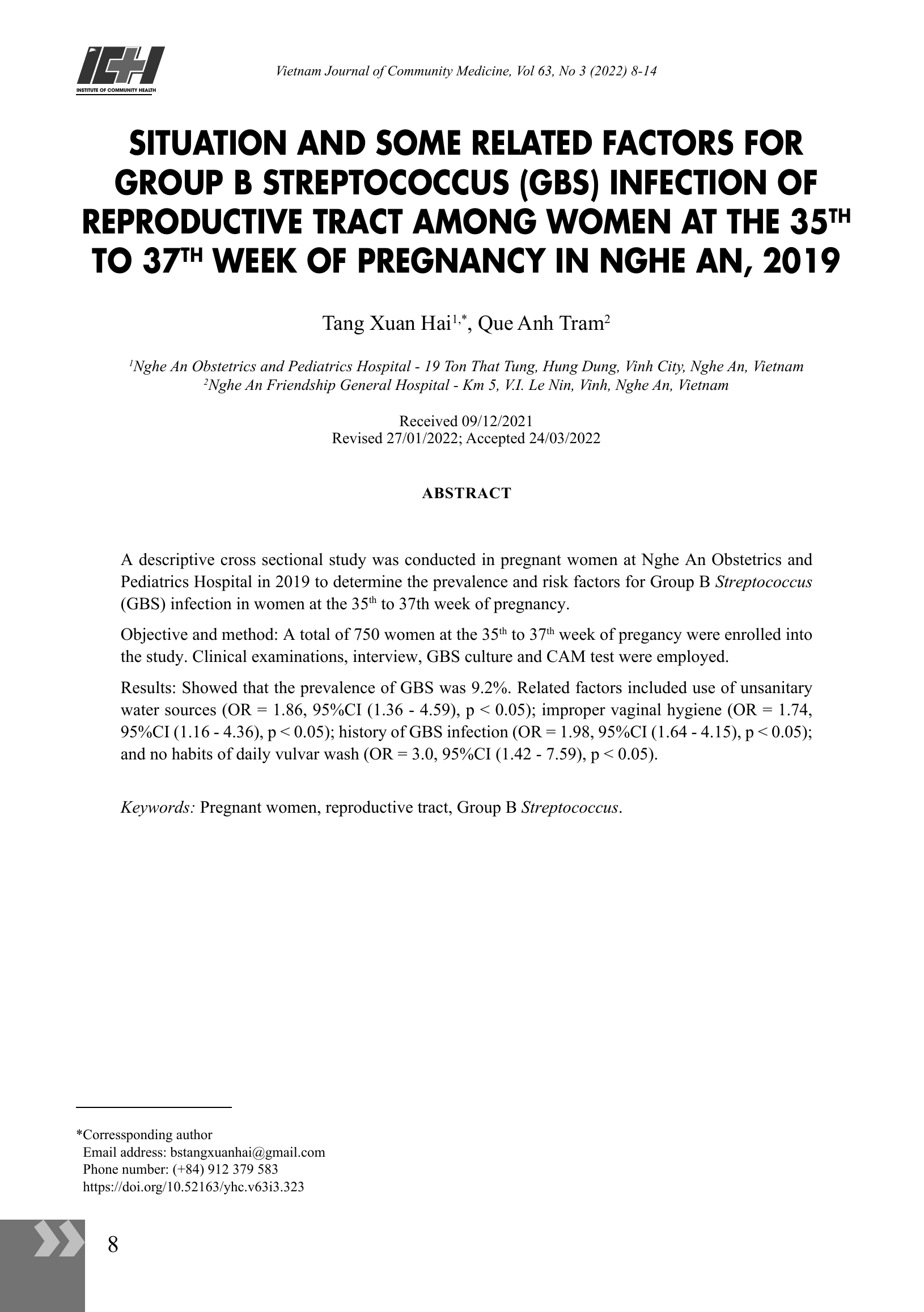 A descriptive cross sectional study was conducted in pregnant women at Nghe An Obstetrics and Pediatrics Hospital in 2019 to determine the prevalence and risk factors for Group B Streptococcus (GBS) infection in women at the 35th to 37th week of pregnancy. Objective and method: A total of 750 women at the 35th to 37th week of pregancy were enrolled into the study. Clinical examinations, interview, GBS culture and CAM test were employed. Results: Showed that the prevalence of GBS was 9.2%. Related factors included use of unsanitary water sources (OR = 1.86, 95%CI (1.36 - 4.59), p < 0.05); improper vaginal hygiene (OR = 1.74, 95%CI (1.16 - 4.36), p < 0.05); history of GBS infection (OR = 1.98, 95%CI (1.64 - 4.15), p < 0.05); and no habits of daily vulvar wash (OR = 3.0, 95%CI (1.42 - 7.59), p < 0.05).