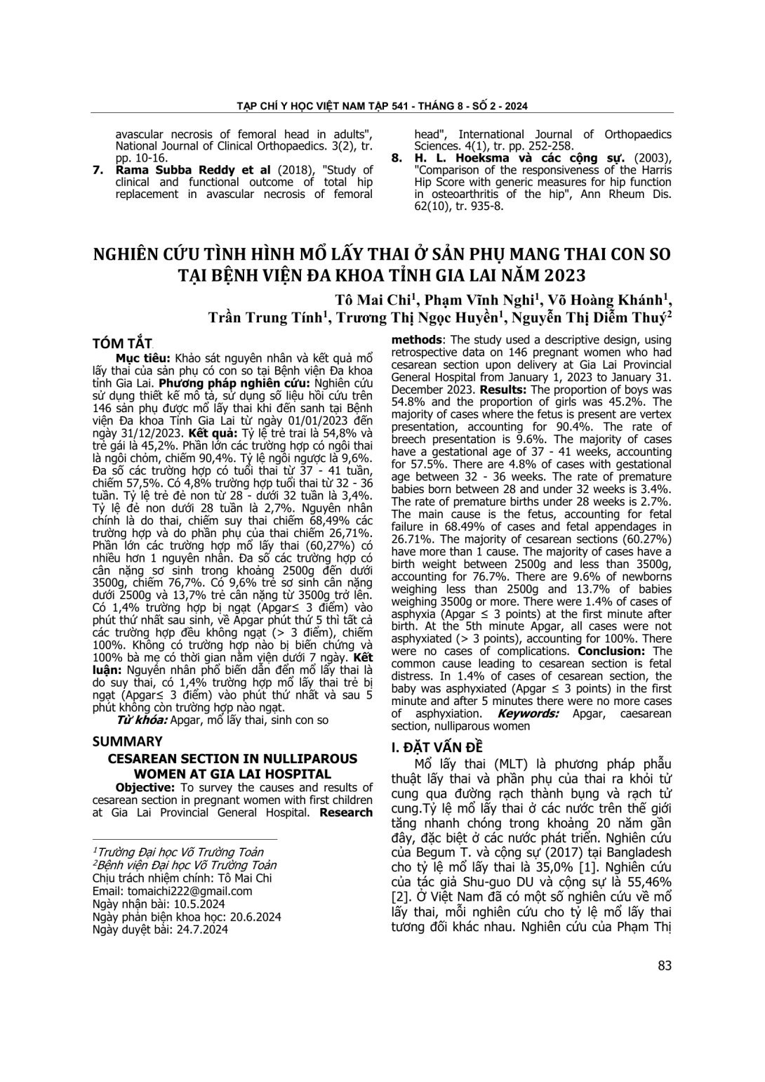 To survey the causes and results of cesarean section in pregnant women with first children at Gia Lai Provincial General Hospital. Research methods: The study used a descriptive design, using retrospective data on 146 pregnant women who had cesarean section upon delivery at Gia Lai Provincial General Hospital from January 1, 2023 to January 31. December 2023. Results: The proportion of boys was 54.8% and the proportion of girls was 45.2%. The majority of cases where the fetus is present are vertex presentation, accounting for 90.4%. The rate of breech presentation is 9.6%. The majority of cases have a gestational age of 37 - 41 weeks, accounting for 57.5%. There are 4.8% of cases with gestational age between 32 - 36 weeks. The rate of premature babies born between 28 and under 32 weeks is 3.4%. The rate of premature births under 28 weeks is 2.7%. The main cause is the fetus, accounting for fetal failure in 68.49% of cases and fetal appendages in 26.71%. The majority of cesarean sections (60.27%) have more than 1 cause. The majority of cases have a birth weight between 2500g and less than 3500g, accounting for 76.7%. There are 9.6% of newborns weighing less than 2500g and 13.7% of babies weighing 3500g or more. There were 1.4% of cases of asphyxia (Apgar ≤ 3 points) at the first minute after birth. At the 5th minute Apgar, all cases were not asphyxiated (> 3 points), accounting for 100%. There were no cases of complications. Conclusion: The common cause leading to cesarean section is fetal distress. In 1.4% of cases of cesarean section, the baby was asphyxiated (Apgar ≤ 3 points) in the first minute and after 5 minutes there were no more cases of asphyxiation.