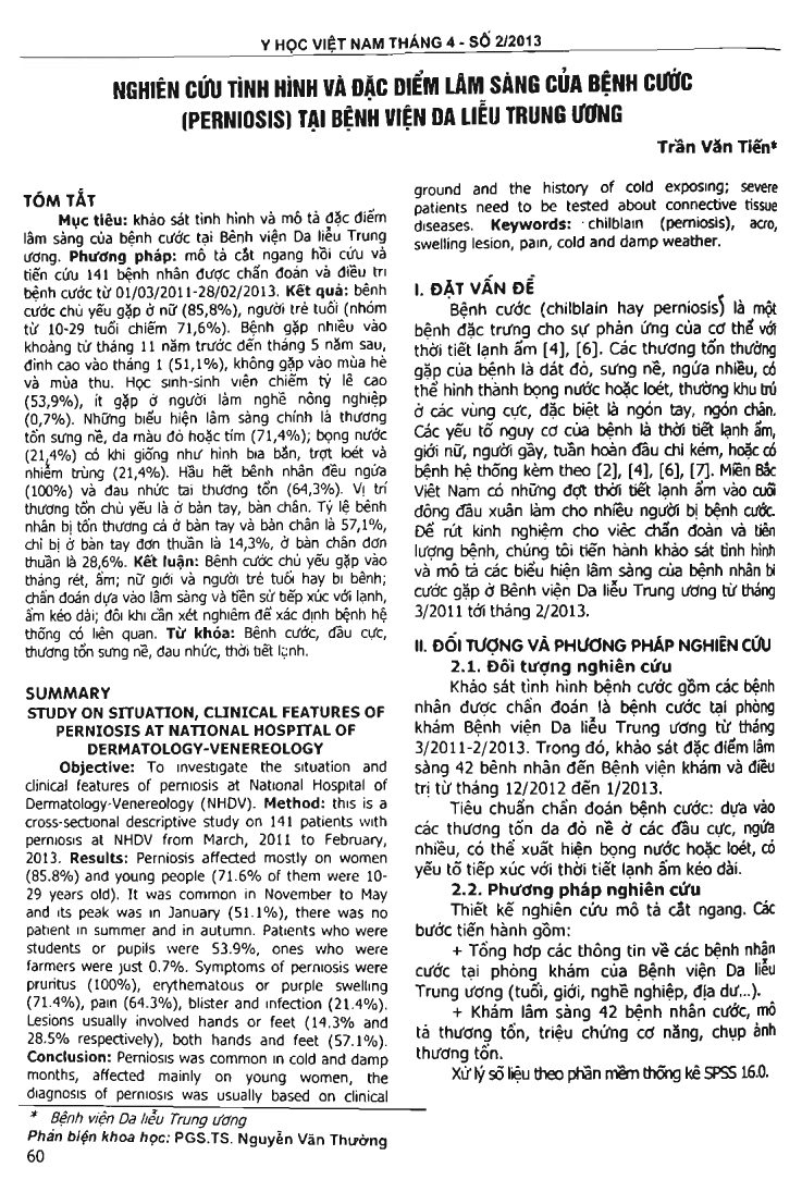Objective: To investigate the situation and clinical features of perniosis at National Hospital of Dermatology-Venereology (NHDV). Method: this is a cross-sectional descriptive study on 141 patients with perniosis at NHDV from March, 2011 to February, 2013. Results: Perniosis affected mostly on women (85.8 percent) and young people (71.6 percent of them were 10-29 years old). It was common in November to May and its peak was in January (51.1 percent), there was no patient in summer and in autumn. Patients who were students or pupils were 53.9 percent, ones who were farmers were just 0.7 percent. Symptoms of perniosis were pruritus (100 percent), erythematous or purple swelling (71.4 percent), pain (64.3 percent), blister and infection (21.4 percent). Lesions usually involved hands or feet (14.3 percent and 28.5 percent respectively), both hands and feet (57.1 percent). Conclusion: Perniosis was common in cold and damp months, affected mainly on young women, the diagnosis of perniosis was usually based on clinical ground and the history of cold exposing; severe patients need to be tested about connective tissue diseases.
