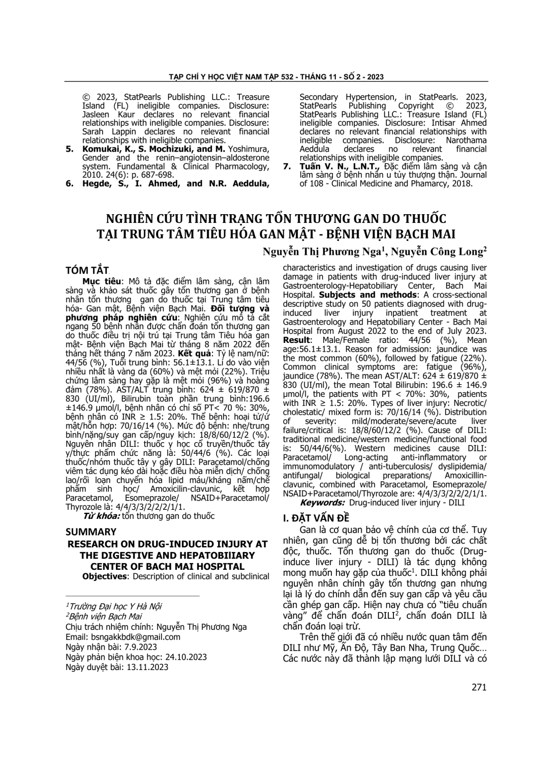 Mô tả đặc điểm lâm sàng, cận lâm sàng và khảo sát thuốc gây tổn thương gan ở bệnh nhân tổn thương gan do thuốc tại Trung tâm tiêu hóa- Gan mật, Bệnh viện Bạch Mai. Đối tượng và phương pháp nghiên cứu: Nghiên cứu mô tả cắt ngang 50 bệnh nhân được chẩn đoán tổn thương gan do thuốc điều trị nội trú tại Trung tâm Tiêu hóa gan mật- Bệnh viện Bạch Mai từ tháng 8 năm 2022 đến tháng hết tháng 7 năm 2023. Kết quả: Tỷ lệ nam/nữ: 44/56 (%), Tuổi trung bình: 56.1±13.1. Lí do vào viện nhiều nhất là vàng da (60%) và mệt mỏi (22%). Triệu chứng lâm sàng hay gặp là mệt mỏi (96%) và hoàng đảm (78%). AST/ALT trung bình: 624 ± 619/870 ± 830 (UI/ml), Bilirubin toàn phần trung bình:196.6 ±146.9 μmol/l, bệnh nhân có chỉ số PT< 70 %: 30%, bệnh nhân có INR ≥ 1.5: 20%. Thể bệnh: hoại tử/ứ mật/hỗn hợp: 70/16/14 (%). Mức độ bệnh: nhẹ/trung bình/nặng/suy gan cấp/nguy kịch: 18/8/60/12/2 (%). Nguyên nhân DILI: thuốc y học cổ truyền/thuốc tây y/thực phẩm chức năng là: 50/44/6 (%). Các loại thuốc/nhóm thuốc tây y gây DILI: Paracetamol/chống viêm tác dụng kéo dài hoặc điều hòa miễn dịch/ chống lao/rối loạn chuyển hóa lipid máu/kháng nấm/chế phẩm sinh học/ Amoxicilin-clavunic, kết hợp Paracetamol, Esomeprazole/ NSAID+Paracetamol/ Thyrozole là: 4/4/3/3/2/2/2/1/1.