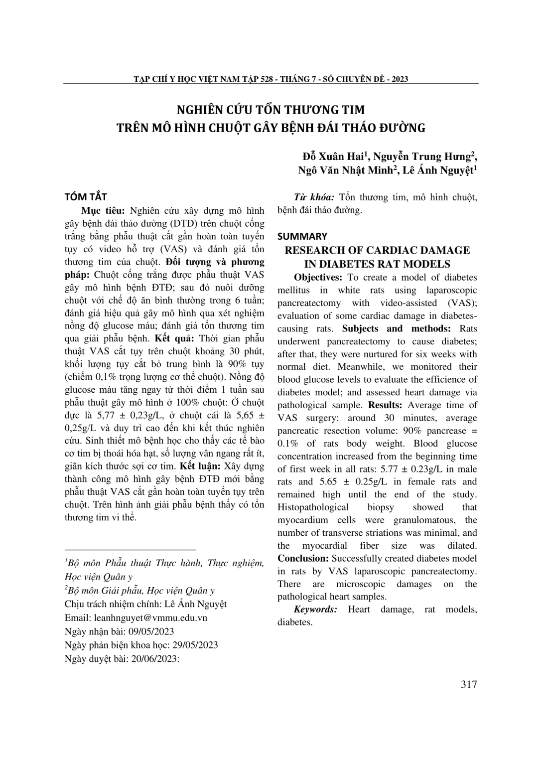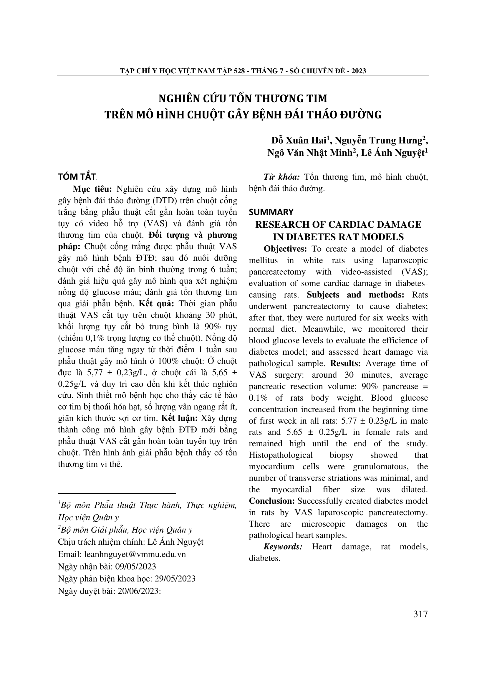 Nghiên cứu xây dựng mô hình gây bệnh đái tháo đường (ĐTĐ) trên chuột cống trắng bằng phẫu thuật cắt gần hoàn toàn tuyến tụy có video hỗ trợ (VAS) và đánh giá tổn thương tim của chuột. Đối tượng và phương pháp: Chuột cống trắng được phẫu thuật VAS gây mô hình bệnh ĐTĐ; sau đó nuôi dưỡng chuột với chế độ ăn bình thường trong 6 tuần; đánh giá hiệu quả gây mô hình qua xét nghiệm nồng độ glucose máu; đánh giá tổn thương tim qua giải phẫu bệnh. Kết quả: Thời gian phẫu thuật VAS cắt tụy trên chuột khoảng 30 phút, khối lượng tụy cắt bỏ trung bình là 90% tụy (chiếm 0,1% trọng lượng cơ thể chuột). Nồng độ glucose máu tăng ngay từ thời điểm 1 tuần sau phẫu thuật gây mô hình ở 100% chuột: Ở chuột đực là 5,77 ± 0,23g/L, ở chuột cái là 5,65 ± 0,25g/L và duy trì cao đến khi kết thúc nghiên cứu. Sinh thiết mô bệnh học cho thấy các tế bào cơ tim bị thoái hóa hạt, số lượng vân ngang rất ít, giãn kích thước sợi cơ tim. Kết luận: Xây dựng thành công mô hình gây bệnh ĐTĐ mới bằng phẫu thuật VAS cắt gần hoàn toàn tuyến tụy trên chuột. Trên hình ảnh giải phẫu bệnh thấy có tổn thương tim vi thể.