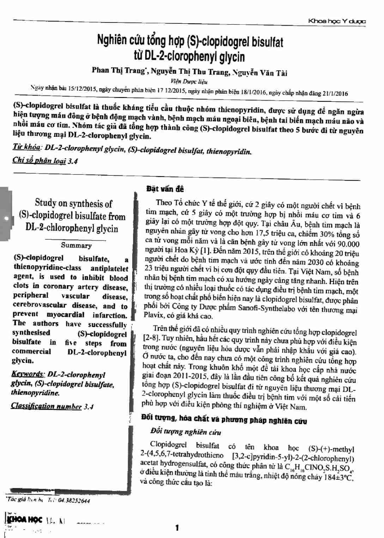 Nghiên cứu tổng hợp (S)-chopidogrei bisulfat từ DL-2-clorophenyl glycin