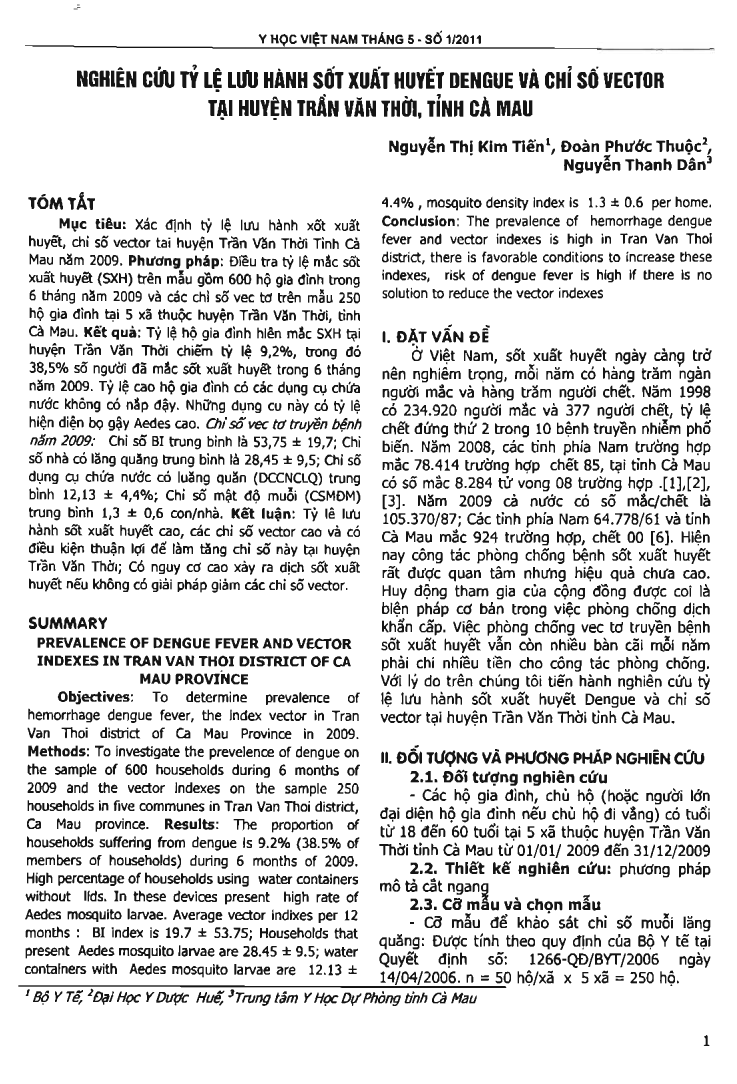 Nghiên cứu tỷ lệ lưu hành sốt xuất huyết Dengue và chỉ số vector tại huyện Trần Văn Thời, tỉnh Cà Mau