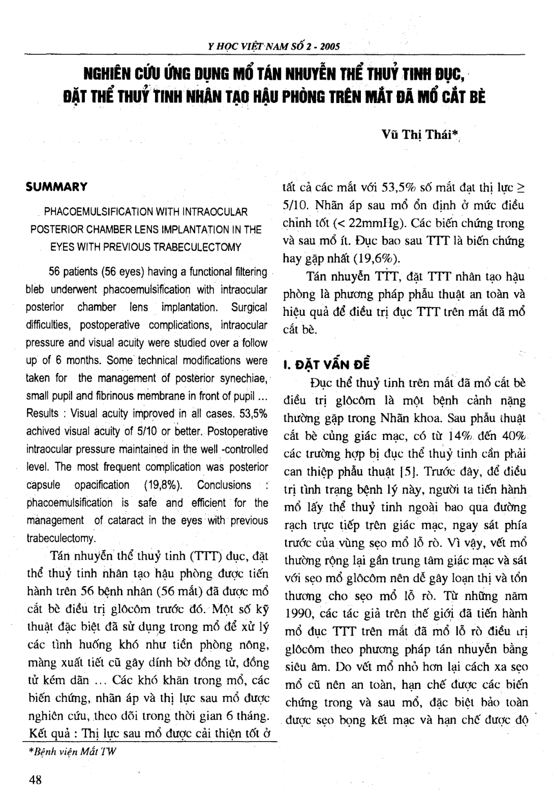 Nghiên cứu được tiến hành trên 56 bệnh nhân đã được mổ cắt bè để điều trị glôcôm nay bị mờ mắt do đục thể thuỷ tinh, có chỉ định mổ lấy thể thuỷ tinh đục, đặt thể thuỷ tinh nhân tạo theo phương pháp mổ tán nhuyễn. Sau mổ, thị lực của các bệnh nhân đã được cải thiện đáng kể. Từ thời điểm 10 ngày sau mổ đến 6 tháng, nhãn áp ổn định, không có trường hợp nào phải điều trị bổ sung hạ nhãn áp. Biến chứng sau mổ chủ yếu là viêm khía giác mạc (15 mắt-26,8% ); 2 trường hợp (3,6% ) đục xơ của vòng bao trước thuỷ tinh thể và 11 trường hợp bị đục bao sau thuỷ tinh thể.