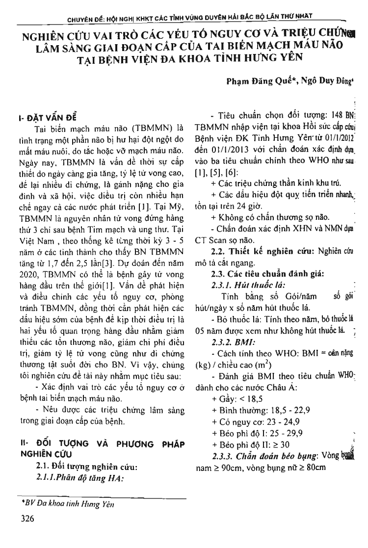 Nghiên cứu vai trò các yếu tố nguy cơ và triệu chứng lâm sàng giai đoạn cấp của tai biến mạch máu não tại Bệnh viện Đa khoa tỉnh Hưng Yên