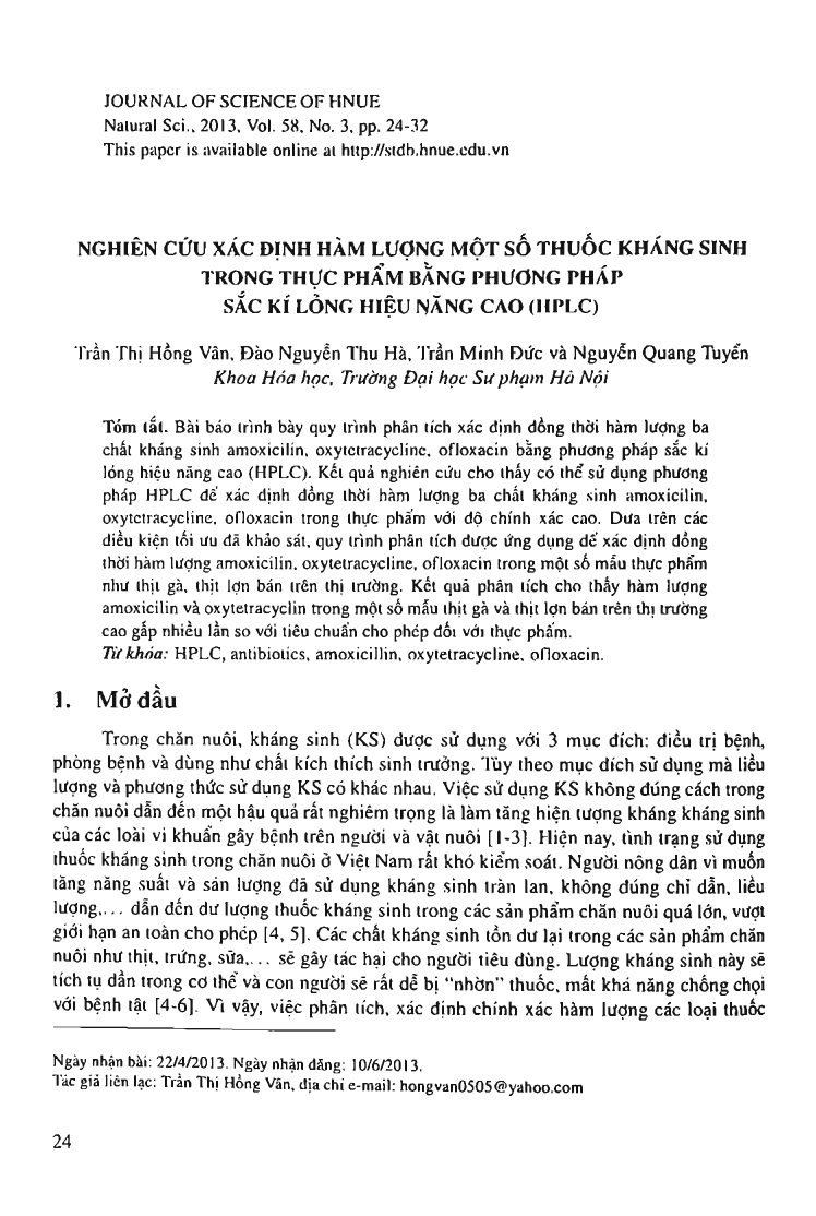 In this study, a simultaneous quantitative determination of three antibiotics (amoxicillin, oxytetracycline and ofloxacin) was made using the High Performance Liquid Chromatography (HPLC) technique. The results show that an HPLC analysis can be used to determine the content of amoxicillin, oxytetracycline and ofloxacin present in food simultaneously and with high precision and accuracy. Under optimal conditions, the process was applied to determine, simultaneously, the content of amoxicillin, oxytetracycline and ofloxacin present in chicken and pork meat that was being sold in the marketplace. The results showed that the content of both amoxicillin and oxytetracycline found in the some samples of chicken and pork meat were much higher than allowed by law.