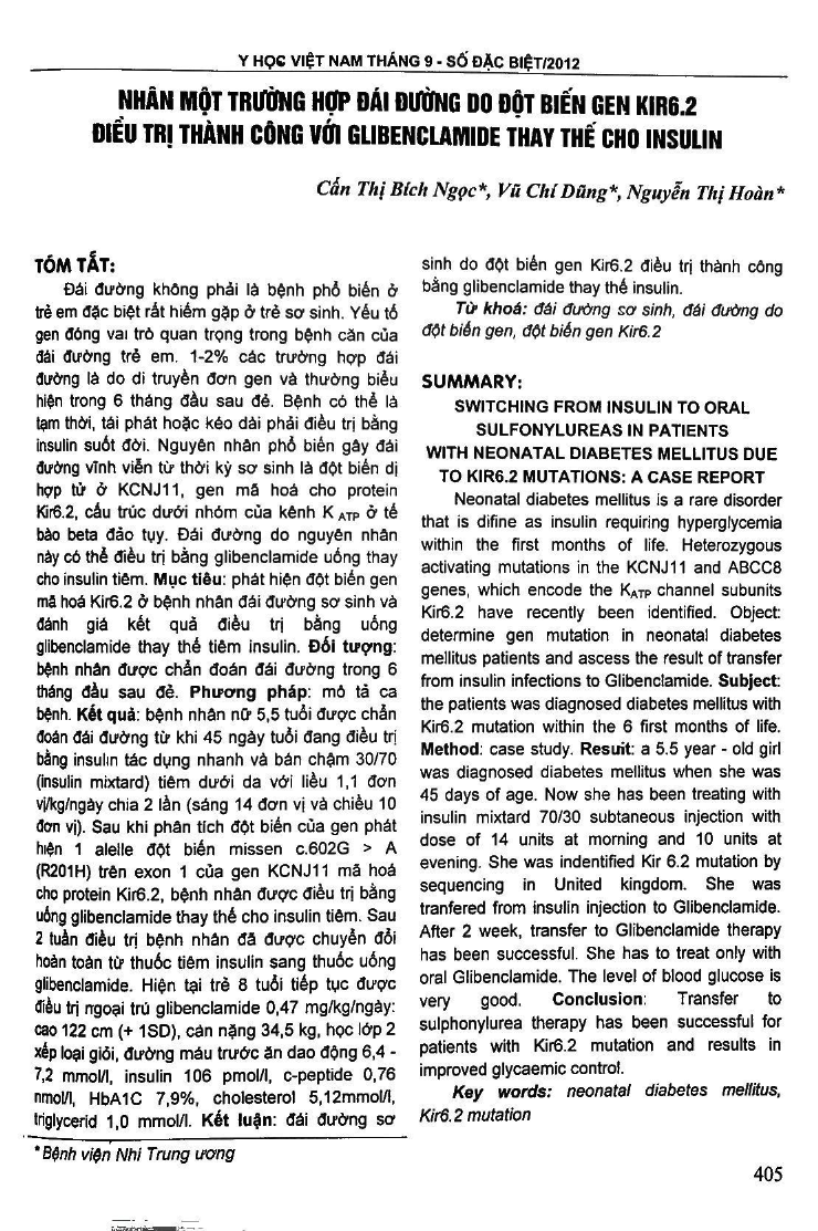 Neonatal diabetes mellitus is a rare disorder that is difine as insulin requiring hyperglycemia within the first months of life. Heterozygous activating mutations in the KCNJ11 and ABCC8 genes, which encode the KATP channel subunits Kir6.2 have recently been identified. Object: determine gen mutation in neonatal diabetes mellitus patients and ascess the result of transfer from insulin infections to Glibenclamide. Subject: the patients was diagnosed diabetes mellitus with Kir6.2 mutation within the 6 first months of life. Method: case study. Result: a 5.5 year - old girl was diagnosed diabetes mellitus when she was 45 days of age. Now she has been treating with insulin mixtard 70/30 subtaneous injection with dose of 14 units at morning and 10 units at evening. She was indentified Kir6.2 mutation by sequencing in United Kingdom. She was tranfered from insulin injection to Glibenclamide. After 2 week, transfer to Glibenclamide therapy has been successful. She has to treat only with oral Glibenclamide. The level of blood glucose is very good. Conclusion: Transfer to sulphonylurea therapy has been successful for patients with Kir6.2 mutation and results in improved glycaemic control.