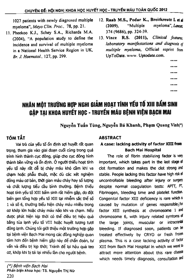 The role of fibrin stabilizing factor is very important, which takes part in the last stage of clot formation and makes the clot strong and stable. People lacking this factor have high risk of uncontrollable bleeding after injury or surgery despite normal coagulation tests: APTT, PT, Fibrinogen, bleeding time and platelet function. Congenital factor XIII deficiency is rare which is caused by mutation of genes responsible for factor XIII synthesis at chromosome 1 and chromosome 6, with injury related symtoms of the large joints, muscular or intracranial bleeding. If diagnosed soon, patients can be treated effectively by CRYO or fresh frozen plasma. This is a case lacking activity of factor XIII from Bach Mai Hospital in which the authors want to attract more attention about this rare disease which needs timely diagnosis, consultation and proper treatment to prevent patients from complications such as muscular malnutrition and joints deformation due to repeated bleeding.