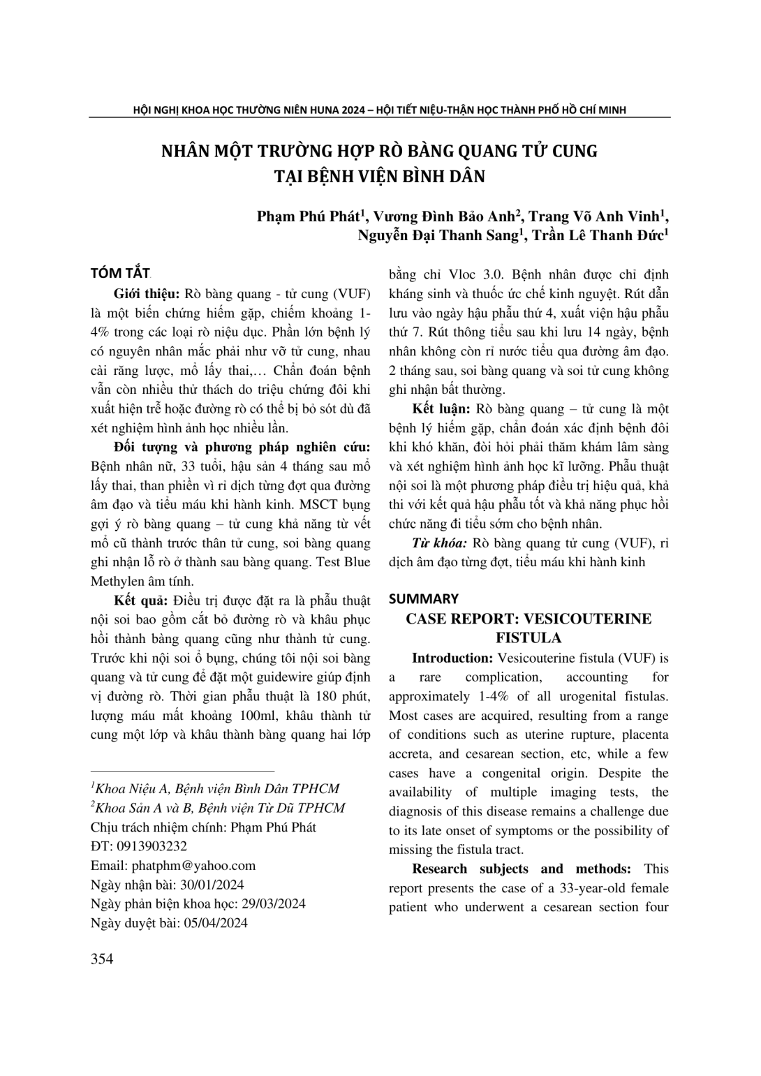 Rò bàng quang - tử cung (VUF) là một biến chứng hiếm gặp, chiếm khoảng 1- 4% trong các loại rò niệu dục. Phần lớn bệnh lý có nguyên nhân mắc phải như vỡ tử cung, nhau cài răng lược, mổ lấy thai,… Chẩn đoán bệnh vẫn còn nhiều thử thách do triệu chứng đôi khi xuất hiện trễ hoặc đường rò có thể bị bỏ sót dù đã xét nghiệm hình ảnh học nhiều lần. Đối tượng và phương pháp nghiên cứu: Bệnh nhân nữ, 33 tuổi, hậu sản 4 tháng sau mổ lấy thai, than phiền vì rỉ dịch từng đợt qua đường âm đạo và tiểu máu khi hành kinh. MSCT bụng gợi ý rò bàng quang – tử cung khả năng từ vết mổ cũ thành trước thân tử cung, soi bàng quang ghi nhận lỗ rò ở thành sau bàng quang. Test Blue Methylen âm tính. Kết quả: Điều trị được đặt ra là phẫu thuật nội soi bao gồm cắt bỏ đường rò và khâu phục hồi thành bàng quang cũng như thành tử cung. Trước khi nội soi ổ bụng, chúng tôi nội soi bàng quang và tử cung để đặt một guidewire giúp định vị đường rò. Thời gian phẫu thuật là 180 phút, lượng máu mất khoảng 100ml, khâu thành tử cung một lớp và khâu thành bàng quang hai lớp bằng chỉ Vloc 3.0. Bệnh nhân được chỉ định kháng sinh và thuốc ức chế kinh nguyệt. Rút dẫn lưu vào ngày hậu phẫu thứ 4, xuất viện hậu phẫu thứ 7. Rút thông tiểu sau khi lưu 14 ngày, bệnh nhân không còn rỉ nước tiểu qua đường âm đạo. 2 tháng sau, soi bàng quang và soi tử cung không ghi nhận bất thường. Kết luận: Rò bàng quang – tử cung là một bệnh lý hiếm gặp, chẩn đoán xác định bệnh đôi khi khó khăn, đòi hỏi phải thăm khám lâm sàng và xét nghiệm hình ảnh học kĩ lưỡng. Phẫu thuật nội soi là một phương pháp điều trị hiệu quả, khả thi với kết quả hậu phẫu tốt và khả năng phục hồi chức năng đi tiểu sớm cho bệnh nhân.