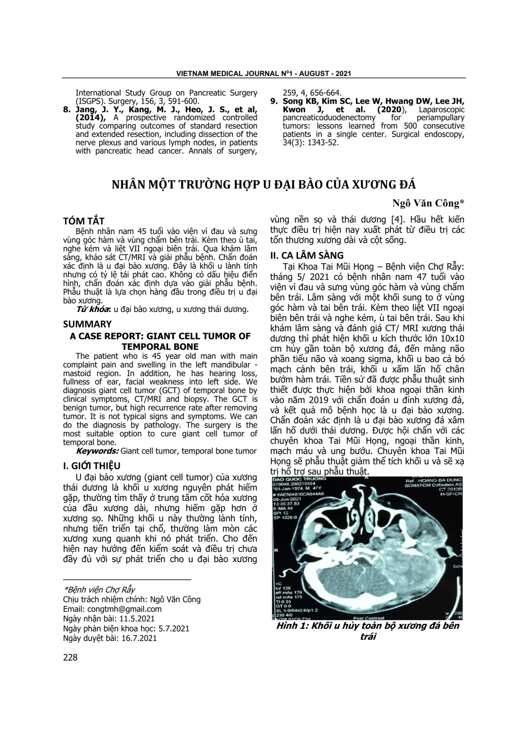 Bệnh nhân nam 45 tuổi vào viện vì đau và sưng vùng góc hàm và vùng chẩm bên trái. Kèm theo ù tai, nghe kém và liệt VII ngoại biên trái. Qua khám lâm sàng, khảo sát CT/MRI và giải phẫu bệnh. Chẩn đoán xác định là u đại bào xương. Đây là khối u lành tính nhưng có tỷ lệ tái phát cao. Không có dấu hiệu điển hình, chẩn đoán xác định dựa vào giải phẫu bệnh. Phẫu thuật là lựa chọn hàng đầu trong điều trị u đại bào xương.