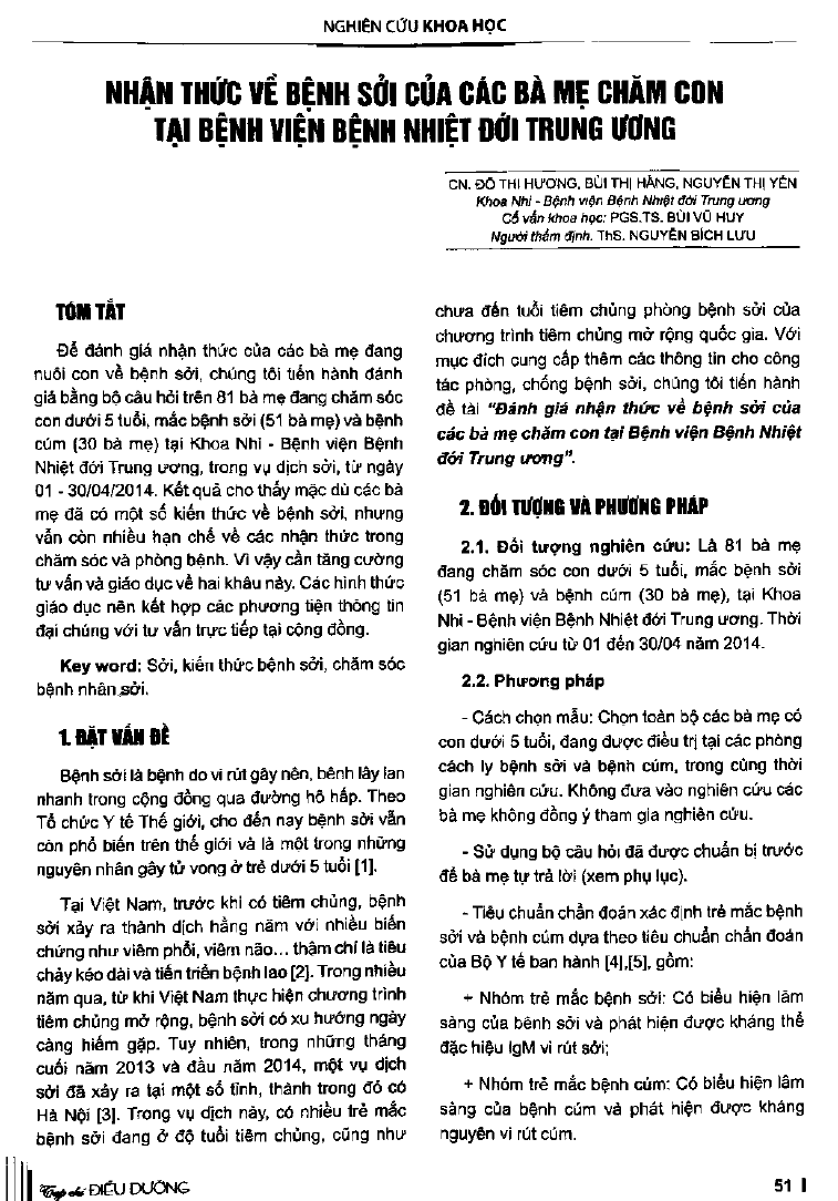 Nhận thức về bệnh sởi của các bà mẹ chăm con tại Bệnh viện Bệnh Nhiệt đới Trung ương