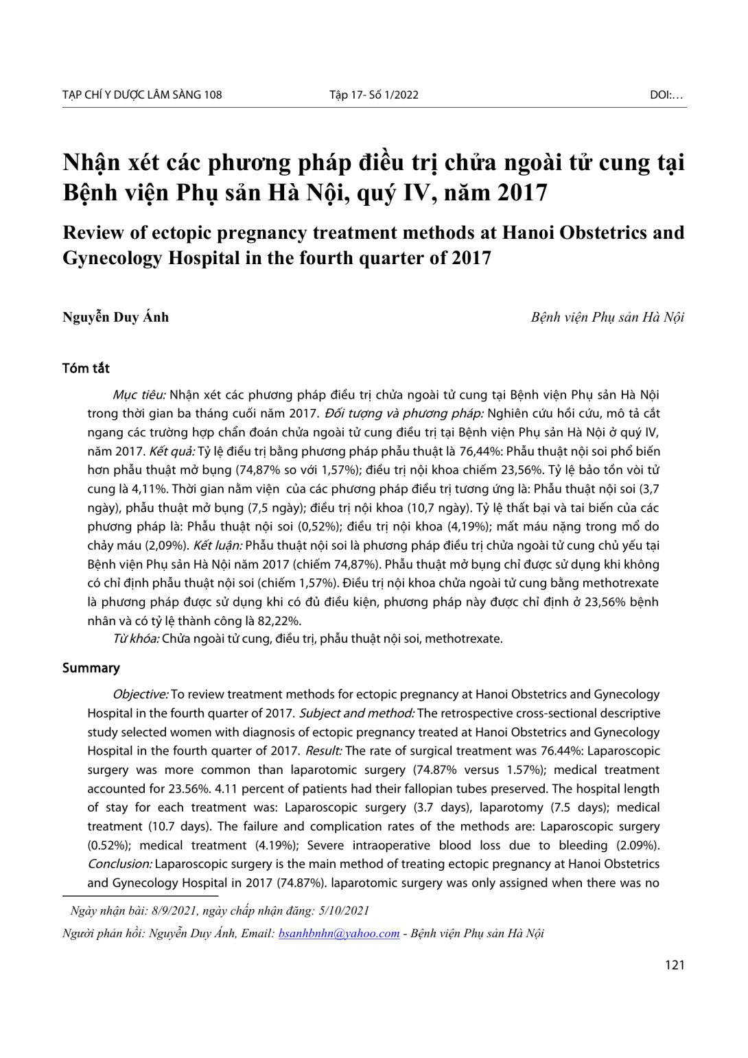 To review treatment methods for ectopic pregnancy at Hanoi Obstetrics and Gynecology Hospital in the fourth quarter of 2017. Subject and method: The retrospective cross-sectional descriptive study selected women with diagnosis of ectopic pregnancy treated at Hanoi Obstetrics and Gynecology Hospital in the fourth quarter of 2017. Result: The rate of surgical treatment was 76.44%: Laparoscopic surgery was more common than laparotomic surgery (74.87% versus 1.57%); medical treatment accounted for 23.56%. 4.11 percent of patients had their fallopian tubes preserved. The hospital length of stay for each treatment was: Laparoscopic surgery (3.7 days), laparotomy (7.5 days); medical treatment (10.7 days). The failure and complication rates of the methods are: Laparoscopic surgery (0.52%); medical treatment (4.19%); Severe intraoperative blood loss due to bleeding (2.09%). Conclusion: Laparoscopic surgery is the main method of treating ectopic pregnancy at Hanoi Obstetrics and Gynecology Hospital in 2017 (74.87%). laparotomic surgery was only assigned when there was no indication for laparoscopic surgery (accounting for 1.57%). Medical treatment of ectopic pregnancy with Methotrexate was used when eligible, this method was indicated in 23.56% of patients and had a success rate of 82.22%.