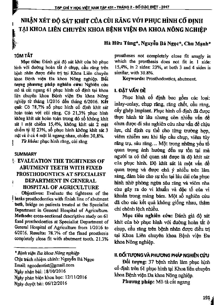 Nhận xét độ sát khít của cùi răng với phục hình cố định tại khoa liên chuyên khoa bệnh viện Đa khoa Nông nghiệp