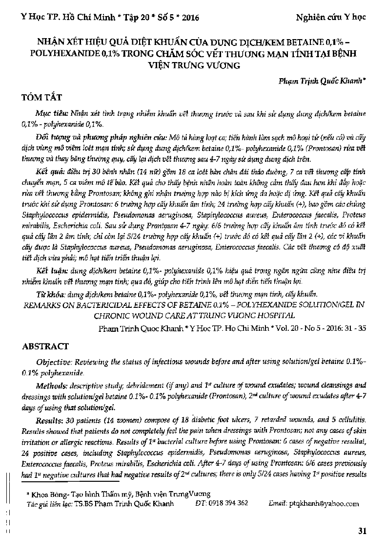 Nhận xét hiệu quả diệt khuẩn của dung dịch/kem Betaine 0,1 phần trăm Polyhexanide 0,1 phần trăm trong chăm sóc vết thương mãn tính tại Bệnh viện Trưng Vương