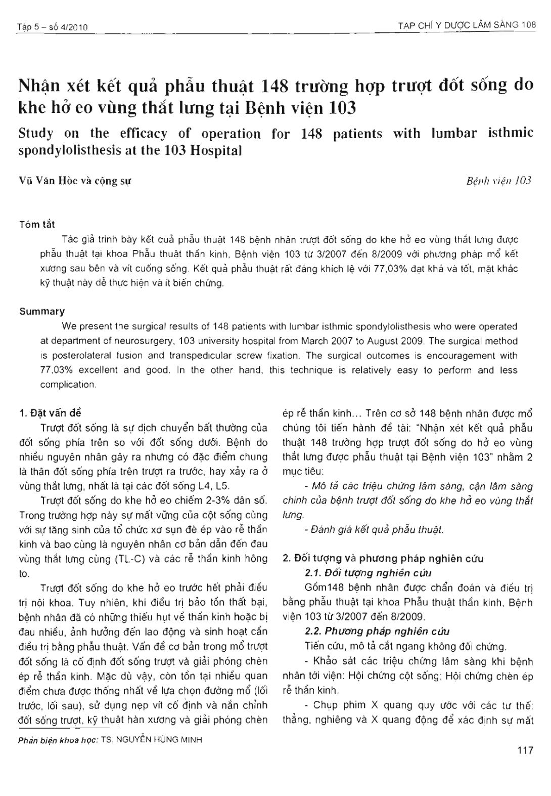Nhận xét kết quả phẫu thuật 148 trường hợp trượt đốt sống do khe hở eo vùng thắt lưng tại bệnh viện 103