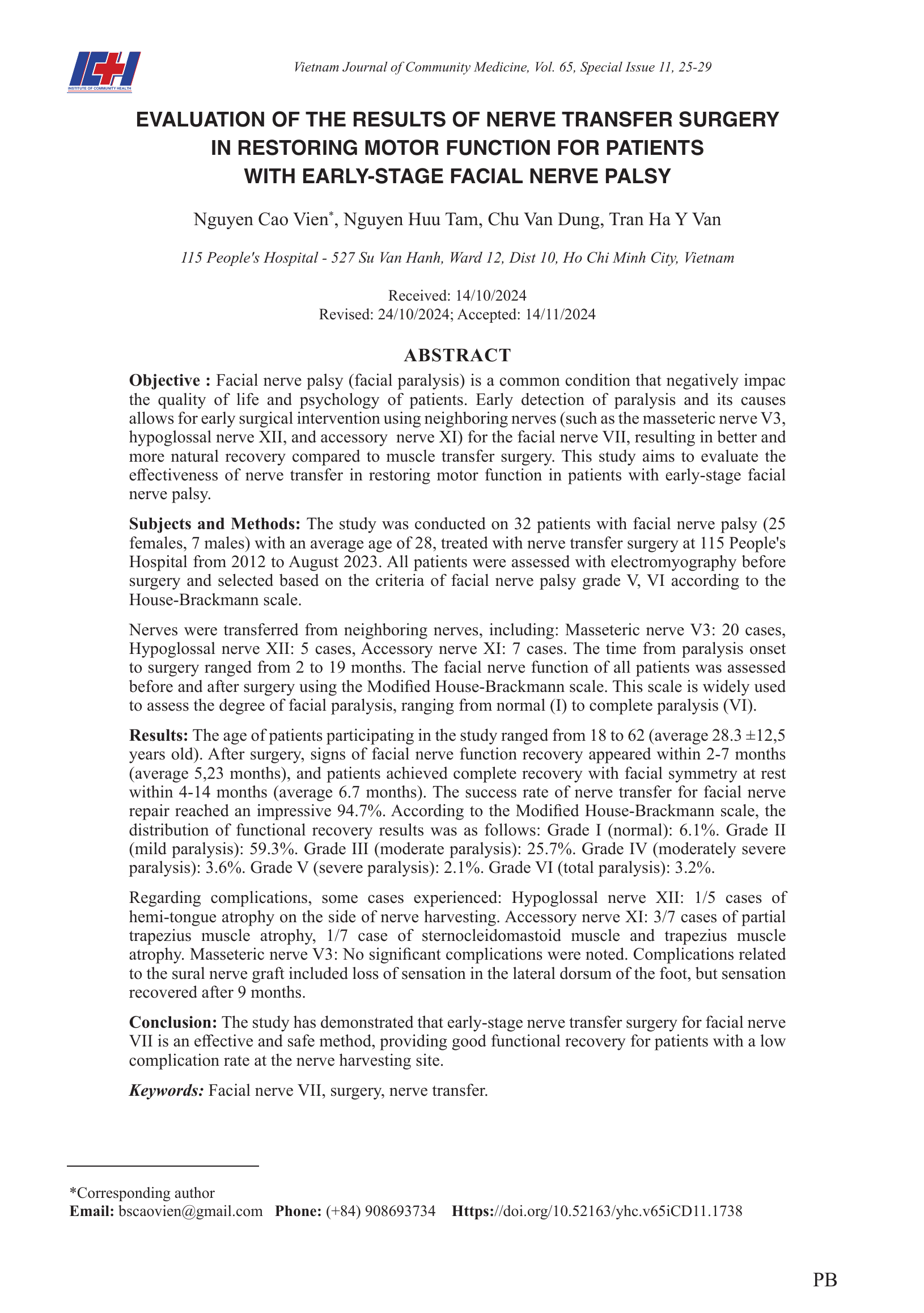 Liệt dây thần kinh số 7 (liệt mặt) là một tình trạng bệnh lý phổ biến, gây ảnh hưởng nghiêm trọng đến chức năng vận động và thẩm mỹ khuôn mặt, từ đó tác động tiêu cực đến chất lượng cuộc sống và tâm lý người bệnh. Việc phát hiện sớm tình trạng liệt cũng như những nguyên nhân gây liệt có thể can thiệp phẫu thuật sớm bằng cách dùng các thần kinh lân cận (như thần kinh cơ cắn V3, thần kinh XII, thần kinh XI) cho thần kinh VII, mang lại sự phục hồi tốt và tự nhiên hơn so với phẫu thuật chuyển cơ. Nghiên cứu này nhằm đánh giá hiệu quả của việc chuyển thần kinh lân cận trong phục hồi chức năng liệt dây thần kinh số VII giai đoạn sớm Đối tượng và Phương pháp: Nghiên cứu được thực hiện trên 32 bệnh nhân bị liệt dây thần kinh VII (25 nữ, 7 nam) với độ tuổi trung bình là 28, được điều trị bằng phương pháp chuyển thần kinh tại Bệnh Viện Nhân Dân 115 từ năm 2012 đến tháng 8 năm 2023. Các bệnh nhân được đều đươc xác định bằng đo điện cơ trước phẫu thuật. lựa chọn dựa trên các tiêu chí liệt dây thần kinh VII, mức V, VI theo thang House-Brackmann. Các bệnh nhân được chuyển thần kinh từ các dây thần kinh lân cận, bao gồm: Thần kinh V3: 20 trường hợp, Thần kinh XII: 5 trường hợp,Thần kinh XI: 7 trường hợp. Thời gian khởi phát liệt đến lúc phẫu thuật từ 2 đến 19 tháng. Chức năng dây thần kinh VII của tất cả bệnh nhân được đánh giá trước và sau phẫu thuật bằng thang điểm Modified House-Brackmann. Thang điểm này là một công cụ được sử dụng rộng rãi để đánh giá mức độ liệt mặt, từ mức độ bình thường (I) đến liệt hoàn toàn (VI). Kết quả : Bệnh nhân tham gia nghiên cứu có độ tuổi từ 18 đến 62 ( tuổi trung bình 28.3 ±12,5 tuổi). Sau phẫu thuật, dấu hiệu phục hồi chức năng thần kinh mặt xuất hiện trong vòng 2-7 tháng (trung bình 5,23 tháng), bệnh nhân đạt được hồi phục hoàn toàn và có sự đối xứng khuôn mặt khi nghỉ ngơi từ 4-14 tháng (trung bình 6,7 tháng). Tỷ lệ thành công của phương pháp chuyển thần kinh lân cận để khâu nối thần kinh VII đạt mức ấn tượng 94,7%. Đánh giá theo thang điểm Modified House-Brackmann, kết quả phục hồi chức năng phân bố như sau: Độ I (hoàn toàn bình thường): 6,1%. Độ II (liệt nhẹ): 59,3%. Độ III (liệt trung bình): 25,7%. Độ IV (liệt trung bình nặng): 3,6%,Độ V (liệt nặng): 2,1%.Độ VI (liệt hoàn toàn): 3,2%. Về biến chứng, một số trường hợp gặp phải: Thần kinh XII: 1/5 trường hợp teo nửa lưỡi bên lấy thần kinh. Thần kinh XI: 3/7 trường hợp teo cơ thang một phần, 1/7 trường hợp teo cơ ức đòn chũm và cơ thang. Thần kinh V3: Không ghi nhận biến chứng đáng kể. Biến chứng về mảnh ghép thần kinh sural xuất hiện mất cảm giác vùng mặt ngoài mu chân, tuy nhiên cảm giác đã hồi phục sau 9 tháng. Kết luận: Nghiên cứu đã chứng minh phẫu thuật chuyển thần kinh lân cận cho thần kinh VII giai đoạn sớm là một phương pháp hiệu quả và an toàn, mang lại khả năng phục hồi chức năng tốt cho người bệnh với tỷ lệ biến chứng thấp tại vị trí lấy thần kinh.