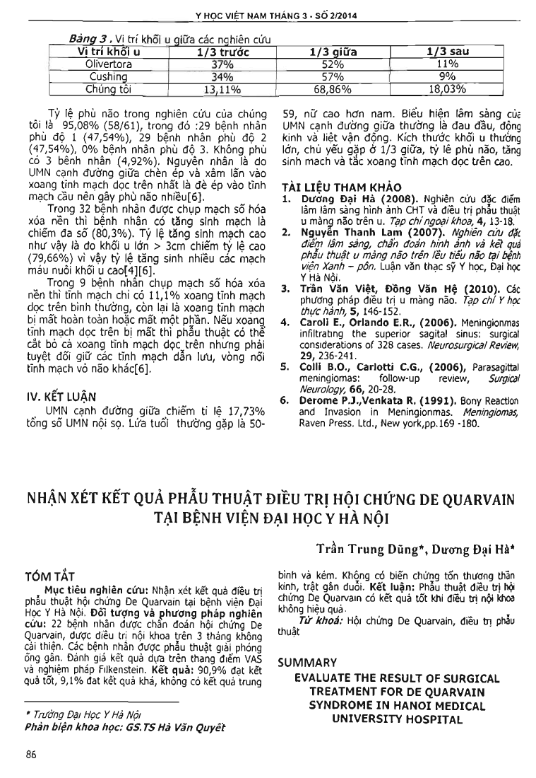 Nhận xét kết quả phẫu thuật điều trị hội chứng De Quarvain tại bệnh viện Đại học Y Hà Nội
