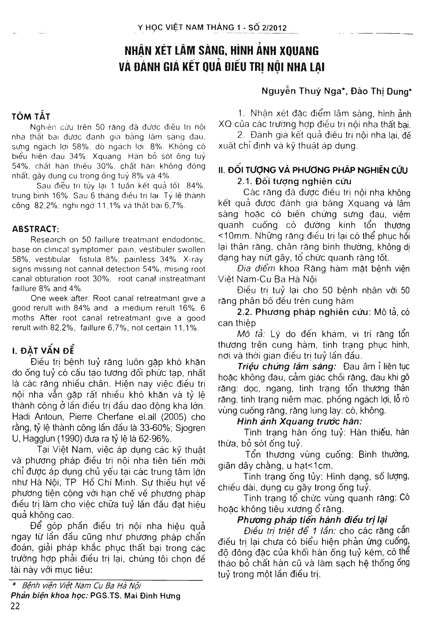 Research on 50 faillure treatmant endodontic, base on clinical symptomer: pain, vestibular swollen 58 percent, vestibular fistula 8 percent, painless 34 percent. X-ray: signs missing not cannal detection 54 percent, mising root canal obturation root 30 percent, root canal instreatmant faillure 8 percent and 4 percent.One week after: Root canal retreatmant give a good rerult with 84 percent and a medium rerult 16 percent. 6 moths After root canal retreatment give a good rerult with 82.2 percent, faillure 6.7 percent, not certain 11.1 percent.