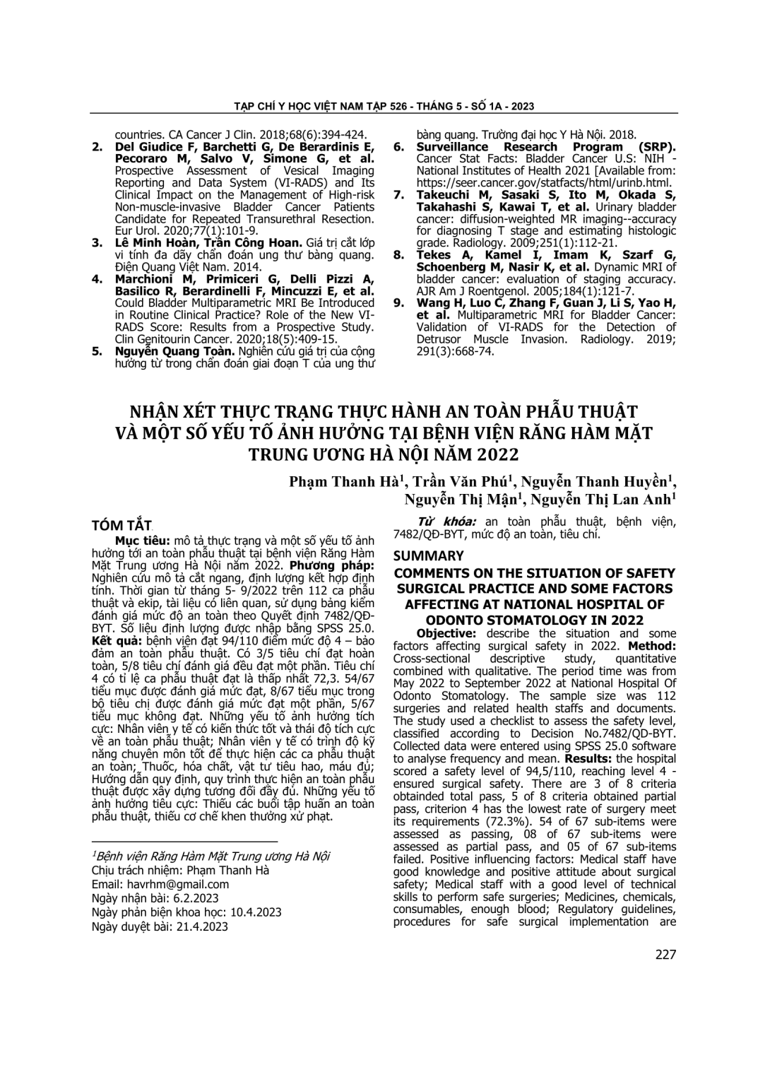 Mô tả thực trạng và một số yếu tố ảnh hưởng tới an toàn phẫu thuật tại bệnh viện Răng Hàm Mặt Trung ương Hà Nội năm 2022. Phương pháp: Nghiên cứu mô tả cắt ngang, định lượng kết hợp định tính. Thời gian từ tháng 5- 9/2022 trên 112 ca phẫu thuật và ekip, tài liệu có liên quan, sử dụng bảng kiểm đánh giá mức độ an toàn theo Quyết định 7482/QĐ-BYT. Số liệu định lượng được nhập bằng SPSS 25.0. Kết quả: bệnh viện đạt 94/110 điểm mức độ 4 – bảo đảm an toàn phẫu thuật. Có 3/5 tiêu chí đạt hoàn toàn, 5/8 tiêu chí đánh giá đều đạt một phần. Tiêu chí 4 có tỉ lệ ca phẫu thuật đạt là thấp nhất 72,3. 54/67 tiểu mục được đánh giá mức đạt, 8/67 tiểu mục trong bộ tiêu chị được đánh giá mức đạt một phần, 5/67 tiểu mục không đạt. Những yếu tố ảnh hưởng tích cực: Nhân viên y tế có kiến thức tốt và thái độ tích cực về an toàn phẫu thuật; Nhân viên y tế có trình độ kỹ năng chuyên môn tốt để thực hiện các ca phẫu thuật an toàn; Thuốc, hóa chất, vật tư tiêu hao, máu đủ; Hướng dẫn quy định, quy trình thực hiện an toàn phẫu thuật được xây dựng tương đối đầy đủ. Những yếu tố ảnh hưởng tiêu cực: Thiếu các buổi tập huấn an toàn phẫu thuật, thiếu cơ chế khen thưởng xử phạt.