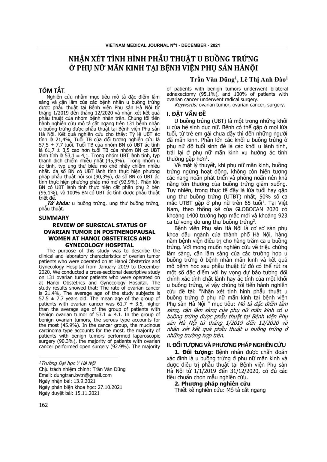 Nghiên cứu nhằm mục tiêu mô tả đặc điểm lâm sàng và cận lâm của các bệnh nhân u buồng trứng được phẫu thuật tại Bệnh viện Phụ sản Hà Nội từ tháng 1/2019 đến tháng 12/2020 và nhận xét kết quả phẫu thuật của nhóm bệnh nhân trên. Chúng tôi tiến hành nghiên cứu mô tả cắt ngang trên 131 bệnh nhân u buồng trứng được phẫu thuật tại Bệnh viện Phụ sản Hà Nội. Kết quả nghiên cứu cho thấy: Tỷ lệ UBT ác tính là 21,4%, Tuổi TB của đối tượng nghiên cứu là 57,5 ± 7,7 tuổi. Tuổi TB của nhóm BN có UBT ác tính là 61,7 ± 3,5 cao hơn tuổi TB của nhóm BN có UBT lành tính là 53,1 ± 4,1. Trong nhóm UBT lành tính, typ thanh dịch chiếm nhiều nhất (45,9%). Trong nhóm u ác tính, typ ung thư biểu mô chế nhầy chiếm nhiều nhất. đa số BN có UBT lành tính thực hiện phương pháp phẫu thuật nội soi (90,3%), đa số BN có UBT ác tính thực hiện phương pháp mổ mở (92,9%). Phần lớn BN có UBT lành tính thực hiện cắt phần phụ 2 bên (95,1%), và 100% BN có UBT ác tính được phẫu thuật triệt để.