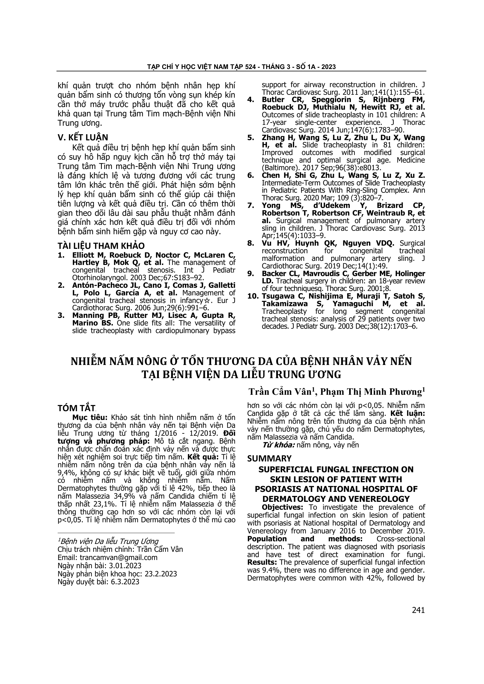 Khảo sát tình hình nhiễm nấm ở tổn thương da của bệnh nhân vảy nến tại Bệnh viện Da liễu Trung ương từ tháng 1/2016 - 12/2019. Đối tượng và phương pháp: Mô tả cắt ngang. Bệnh nhân được chẩn đoán xác định vảy nến và được thực hiện xét nghiệm soi trực tiếp tìm nấm. Kết quả: Tỉ lệ nhiễm nấm nông trên da của bệnh nhân vảy nến là 9,4%, không có sự khác biệt về tuổi, giới giữa nhóm có nhiễm nấm và không nhiễm nấm. Nấm Dermatophytes thường gặp với tỉ lệ 42%, tiếp theo là nấm Malassezia 34,9% và nấm Candida chiếm tỉ lệ thấp nhất 23,1%. Tỉ lệ nhiễm nấm Malassezia ở thể thông thường cao hơn so với các nhóm còn lại với p<0,05. Tỉ lệ nhiễm nấm Dermatophytes ở thể mủ cao hơn so với các nhóm còn lại với p<0,05. Nhiễm nấm Candida gặp ở tất cả các thể lâm sàng. Kết luận: Nhiễm nấm nông trên tổn thương da của bệnh nhân vảy nến thường gặp, chủ yếu do nấm Dermatophytes, nấm Malassezia và nấm Candida.