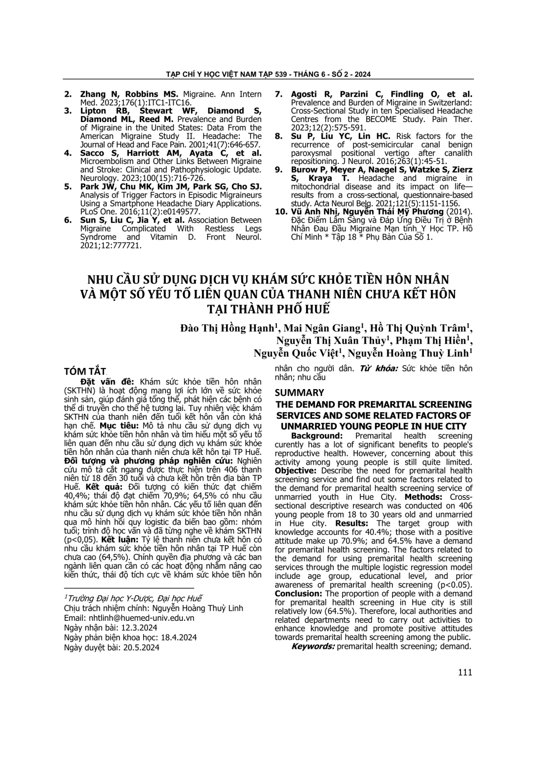 Khám sức khỏe tiền hôn nhân (SKTHN) là hoạt động mang lợi ích lớn về sức khỏe sinh sản, giúp đánh giá tổng thể, phát hiện các bệnh có thể di truyền cho thế hệ tương lai. Tuy nhiên việc khám SKTHN của thanh niên đến tuổi kết hôn vẫn còn khá hạn chế. Mục tiêu: Mô tả nhu cầu sử dụng dịch vụ khám sức khỏe tiền hôn nhân và tìm hiểu một số yếu tố liên quan đến nhu cầu sử dụng dịch vụ khám sức khỏe tiền hôn nhân của thanh niên chưa kết hôn tại TP Huế. Đối tượng và phương pháp nghiên cứu: Nghiên cứu mô tả cắt ngang được thực hiện trên 406 thanh niên từ 18 đến 30 tuổi và chưa kết hôn trên địa bàn TP Huế. Kết quả: Đối tượng có kiến thức đạt chiếm 40,4%; thái độ đạt chiếm 70,9%; 64,5% có nhu cầu khám sức khỏe tiền hôn nhân. Các yếu tố liên quan đến nhu cầu sử dụng dịch vụ khám sức khỏe tiền hôn nhân qua mô hình hồi quy logistic đa biến bao gồm: nhóm tuổi; trình độ học vấn và đã từng nghe về khám SKTHN (p<0,05). Kết luận: Tỷ lệ thanh niên chưa kết hôn có nhu cầu khám sức khỏe tiền hôn nhân tại TP Huế còn chưa cao (64,5%). Chính quyền địa phương và các ban ngành liên quan cần có các hoạt động nhằm nâng cao kiến thức, thái độ tích cực về khám sức khỏe tiền hôn nhân cho người dân.