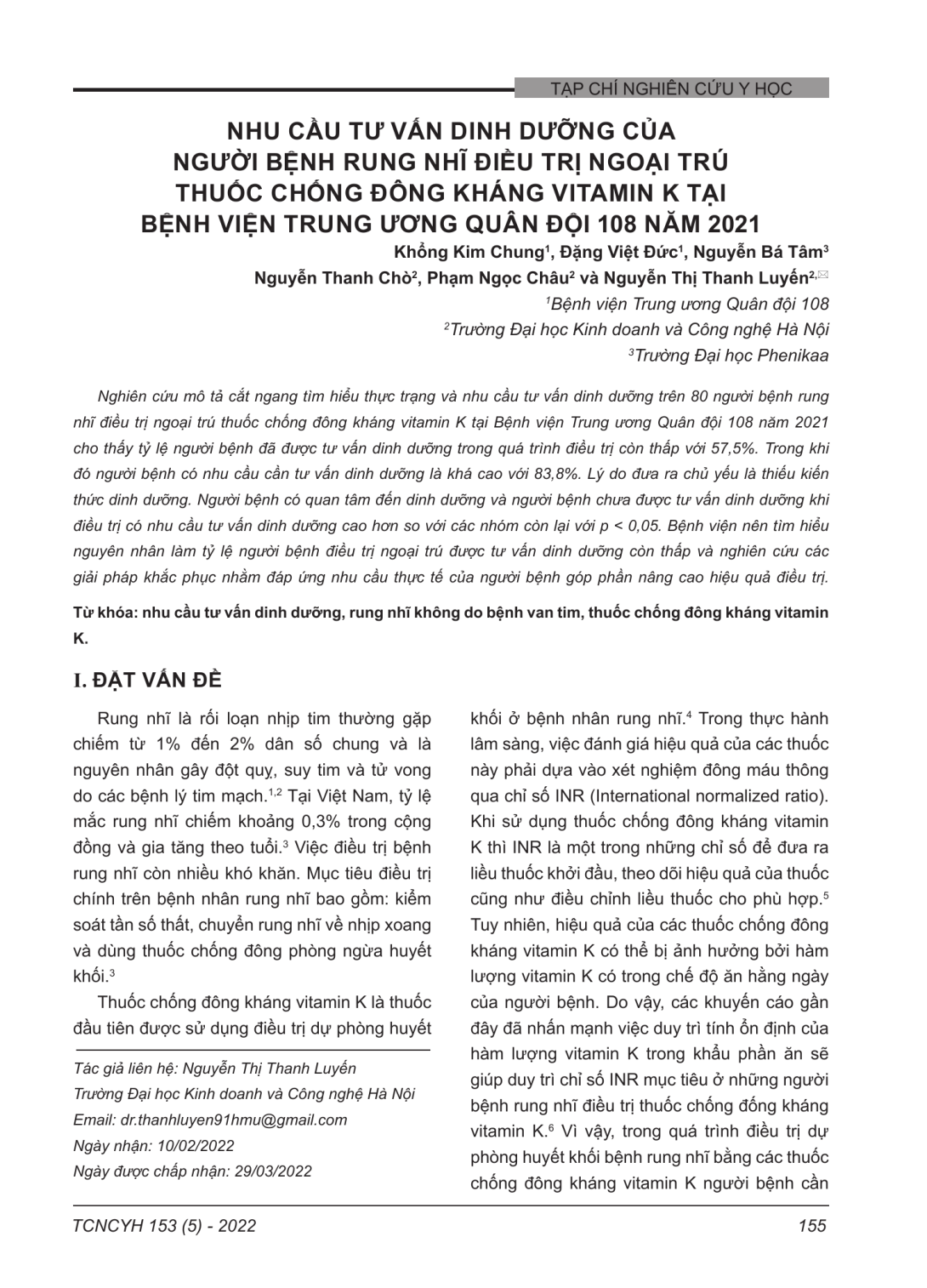 Nghiên cứu mô tả cắt ngang tìm hiểu thực trạng và nhu cầu tư vấn dinh dưỡng trên 80 người bệnh rung nhĩ điều trị ngoại trú thuốc chống đông kháng vitamin K tại Bệnh viện Trung ương Quân đội 108 năm 2021 cho thấy tỷ lệ người bệnh đã được tư vấn dinh dưỡng trong quá trình điều trị còn thấp với 57,5%. Trong khi đó người bệnh có nhu cầu cần tư vấn dinh dưỡng là khá cao với 83,8%. Lý do đưa ra chủ yếu là thiếu kiến thức dinh dưỡng. Người bệnh có quan tâm đến dinh dưỡng và người bệnh chưa được tư vấn dinh dưỡng khi điều trị có nhu cầu tư vấn dinh dưỡng cao hơn so với các nhóm còn lại với p < 0,05. Bệnh viện nên tìm hiểu nguyên nhân làm tỷ lệ người bệnh điều trị ngoại trú được tư vấn dinh dưỡng còn thấp và nghiên cứu các giải pháp khắc phục nhằm đáp ứng nhu cầu thực tế của người bệnh góp phần nâng cao hiệu quả điều trị.
