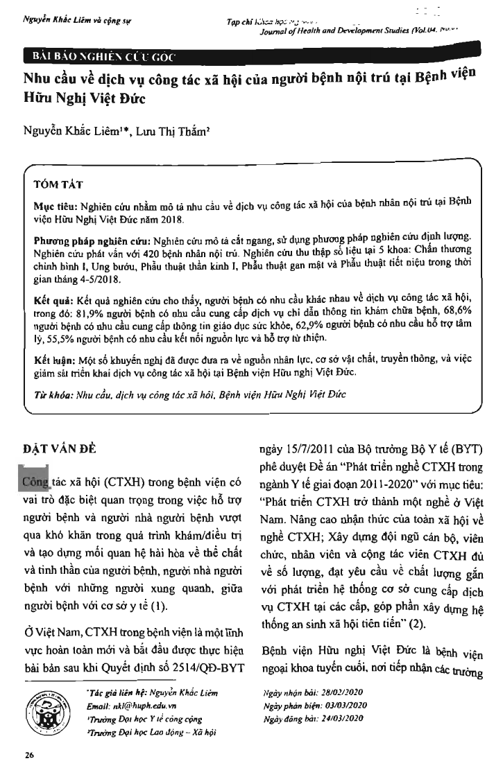 Nghiên cứu nhằm mô tả nhu cầu về dịch vụ công tác xã hội của bệnh nhân nội trú tại Bệnh viện Hữu Nghị Việt Đức năm 2018. Kết quả nghiên cứu cho thấy, người bệnh có nhu cầu khác nhau về dịch vụ công tác xã hội, trong đó 81,9% người bệnh có nhu cầu cung cấp dịch vụ chỉ dẫn thông tin khám chữa bệnh, 68,6% người bệnh, có nhu cầu cung cấp thông tin giáo dục sức khỏe, 62,9% người bệnh có nhu cầu hỗ trợ tâm lý, 55,5% người bệnh có nhu cầu kết nối nguồn lực và hỗ trợ từ thiện. Một số khuyến nghị đã được đưa ra về nguồn nhân lực, cơ sở vật chất, truyền thông, và việc giám sát triển khai dịch vụ công tác xã hội tại Bệnh viện Hữu nghị Việt Đức.