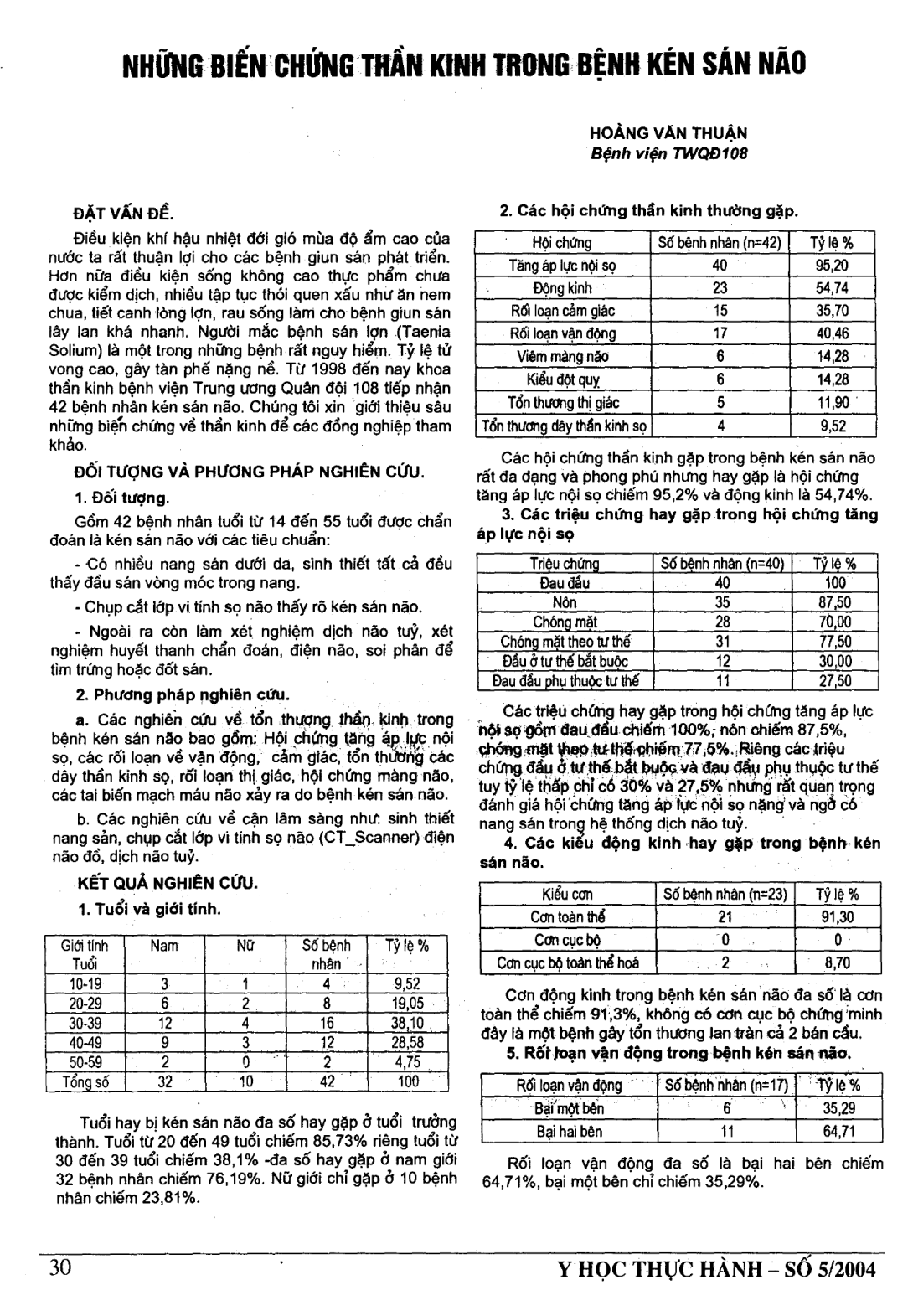 Nghiên cứu 42 bệnh nhân bị kén sán não tuổi từ 14 đến 55, trong đó có 32 nam và 10 nữ, nhận thấy: tuổi hay gặp kén sán não là 20 đến 40 tuổi (85,73), nam giới chiếm 76,19. Các hội chứng thần kinh hay gặp rất đa dạng cả 2 bán cầu, hội chứng tăng áp lực nội sọ hay gặp nhất chiếm 95,20 đến viện 73,81 là thể hoạt động cần điều trị. Hình ảnh chụp cắt lớp vi tính sọ não thấy kén sán nằm khắp cả 2 bán cầu phù hợp với triệu chứng lâm sàng