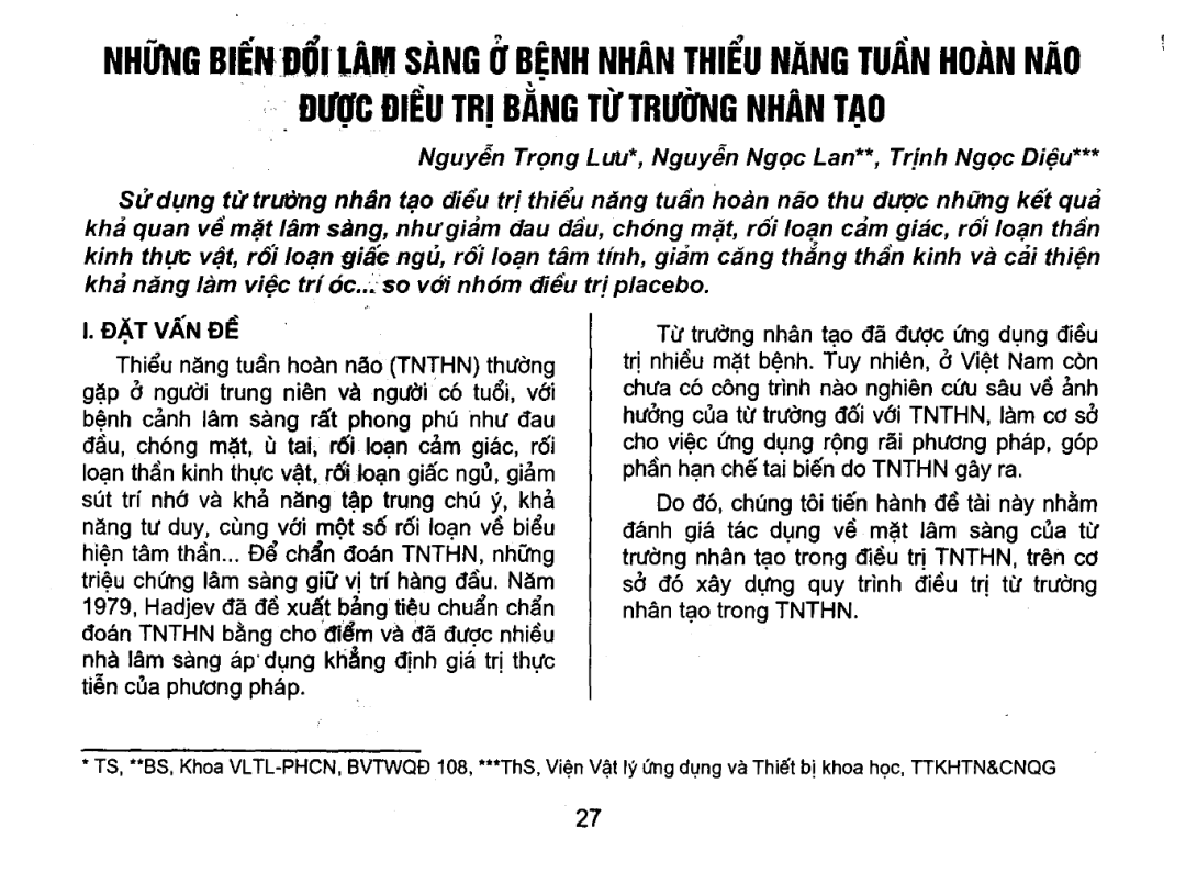 Những biến đổi lâm sàng ở bệnh nhân thiểu năng tuần hoàn não được điều trị bằng từ trường nhân tạo