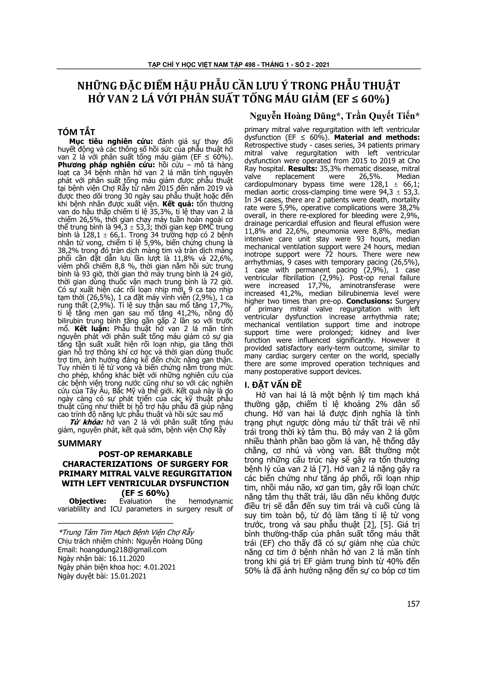 Đánh giá sự thay đổi huyết động và các thông số hồi sức của phẫu thuật hở van 2 lá với phân suất tống máu giảm (EF ≤ 60%). Phương pháp nghiên cứu: hồi cứu – mô tả hàng loạt ca 34 bệnh nhân hở van 2 lá mãn tính nguyên phát với phân suất tống máu giảm được phẫu thuật tại bệnh viện Chợ Rẫy từ năm 2015 đến năm 2019 và được theo dõi trong 30 ngày sau phẫu thuật hoặc đến khi bệnh nhân được xuất viện. Kết quả: tổn thương van do hậu thấp chiếm tỉ lệ 35,3%, tỉ lệ thay van 2 lá chiếm 26,5%, thời gian chạy máy tuần hoàn ngoài cơ thể trung bình là 94,3 53,3; thời gian kẹp ĐMC trung bình là 128,1 66,1. Trong 34 trường hợp có 2 bệnh nhân tử vong, chiếm tỉ lệ 5,9%, biến chứng chung là 38,2% trong đó tràn dịch màng tim và tràn dịch màng phổi cần đặt dẫn lưu lần lượt là 11,8% và 22,6%, viêm phổi chiếm 8,8 %, thời gian nằm hồi sức trung bình là 93 giờ, thời gian thở máy trung bình là 24 giờ, thời gian dùng thuốc vận mạch trung bình là 72 giờ. Có sự xuất hiện các rối loạn nhịp mới, 9 ca tạo nhịp tạm thời (26,5%), 1 ca đặt máy vĩnh viễn (2,9%), 1 ca rung thất (2,9%). Tỉ lệ suy thận sau mổ tăng 17,7%, tỉ lệ tăng men gan sau mổ tăng 41,2%, nồng độ bilirubin trung bình tăng gần gấp 2 lần so với trước mổ. Kết luận: Phẫu thuật hở van 2 lá mãn tính nguyên phát với phân suất tống máu giảm có sự gia tăng tần suất xuất hiện rối loạn nhịp, gia tăng thời gian hỗ trợ thông khí cơ học và thời gian dùng thuốc trợ tim, ảnh hưởng đáng kể đến chức năng gan thận. Tuy nhiên tỉ lệ tử vong và biến chứng nằm trong mức cho phép, không khác biệt với những nghiên cứu của các bệnh viện trong nước cũng như so với các nghiên cứu của Tây u, Bắc Mỹ và thế giới. Kết quả này là do ngày càng có sự phát triển của các kỹ thuật phẫu thuật cũng như thiết bị hỗ trợ hậu phẫu đã giúp nâng cao trình độ năng lực phẫu thuật và hồi sức sau mổ