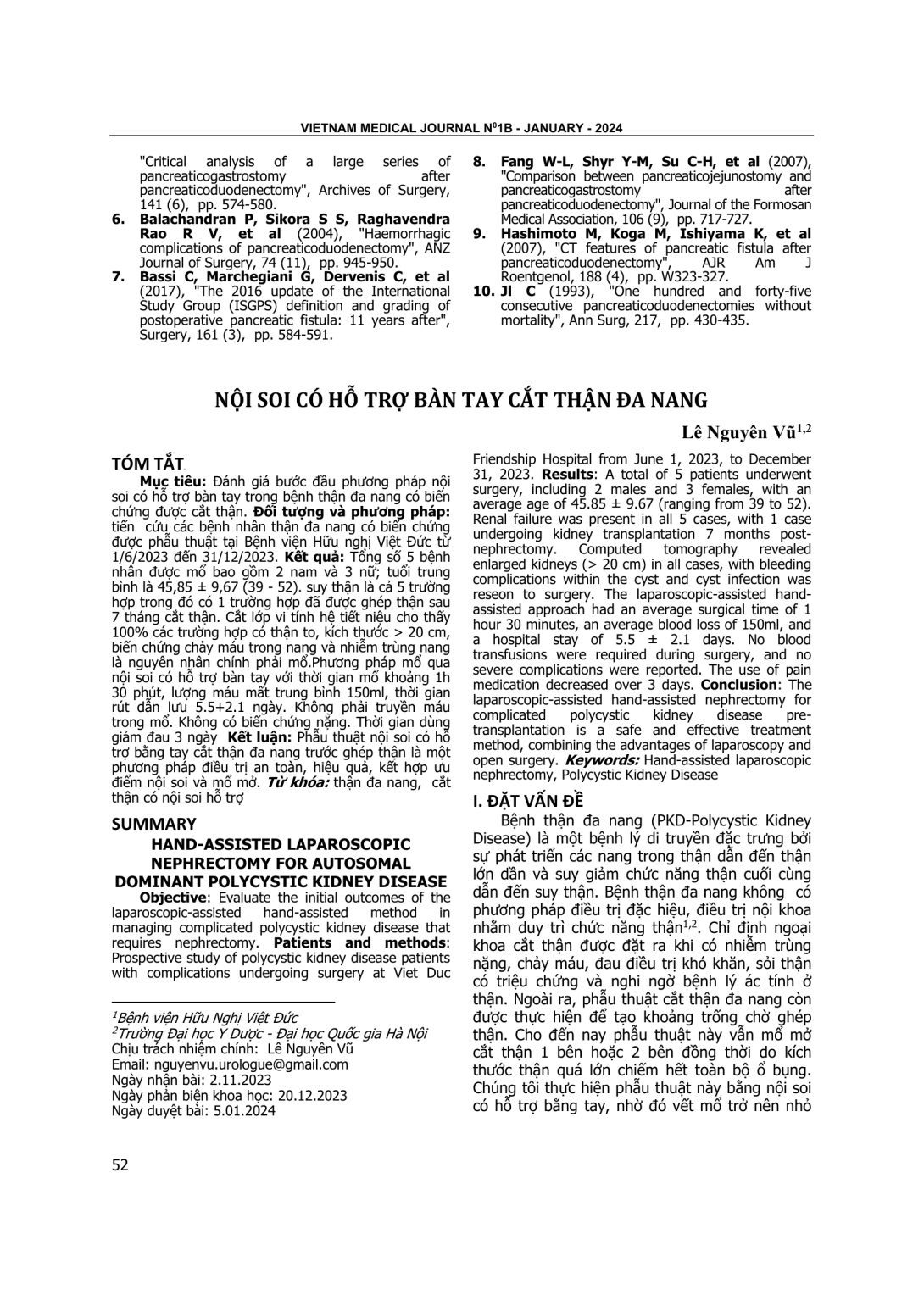Đánh giá bước đầu phương pháp nội soi có hỗ trợ bàn tay trong bệnh thận đa nang có biến chứng được cắt thận. Đối tượng và phương pháp: tiến cứu các bệnh nhân thận đa nang có biến chứng được phẫu thuật tại Bệnh viện Hữu nghị Việt Đức từ 1/6/2023 đến 31/12/2023. Kết quả: Tổng số 5 bệnh nhân được mổ bao gồm 2 nam và 3 nữ; tuổi trung bình là 45,85 ± 9,67 (39 - 52). suy thận là cả 5 trường hợp trong đó có 1 trường hợp đã được ghép thận sau 7 tháng cắt thận. Cắt lớp vi tính hệ tiết niệu cho thấy 100% các trường hợp có thận to, kích thước > 20 cm, biến chứng chảy máu trong nang và nhiễm trùng nang là nguyên nhân chính phải mổ.Phương pháp mổ qua nội soi có hỗ trợ bàn tay với thời gian mổ khoảng 1h 30 phút, lượng máu mất trung bình 150ml, thời gian rút dẫn lưu 5.5+2.1 ngày. Không phải truyền máu trong mổ. Không có biến chứng nặng. Thời gian dùng giảm đau 3 ngày Kết luận: Phẫu thuật nội soi có hỗ trợ bằng tay cắt thận đa nang trước ghép thận là một phương pháp điều trị an toàn, hiệu quả, kết hợp ưu điểm nội soi và mổ mở.